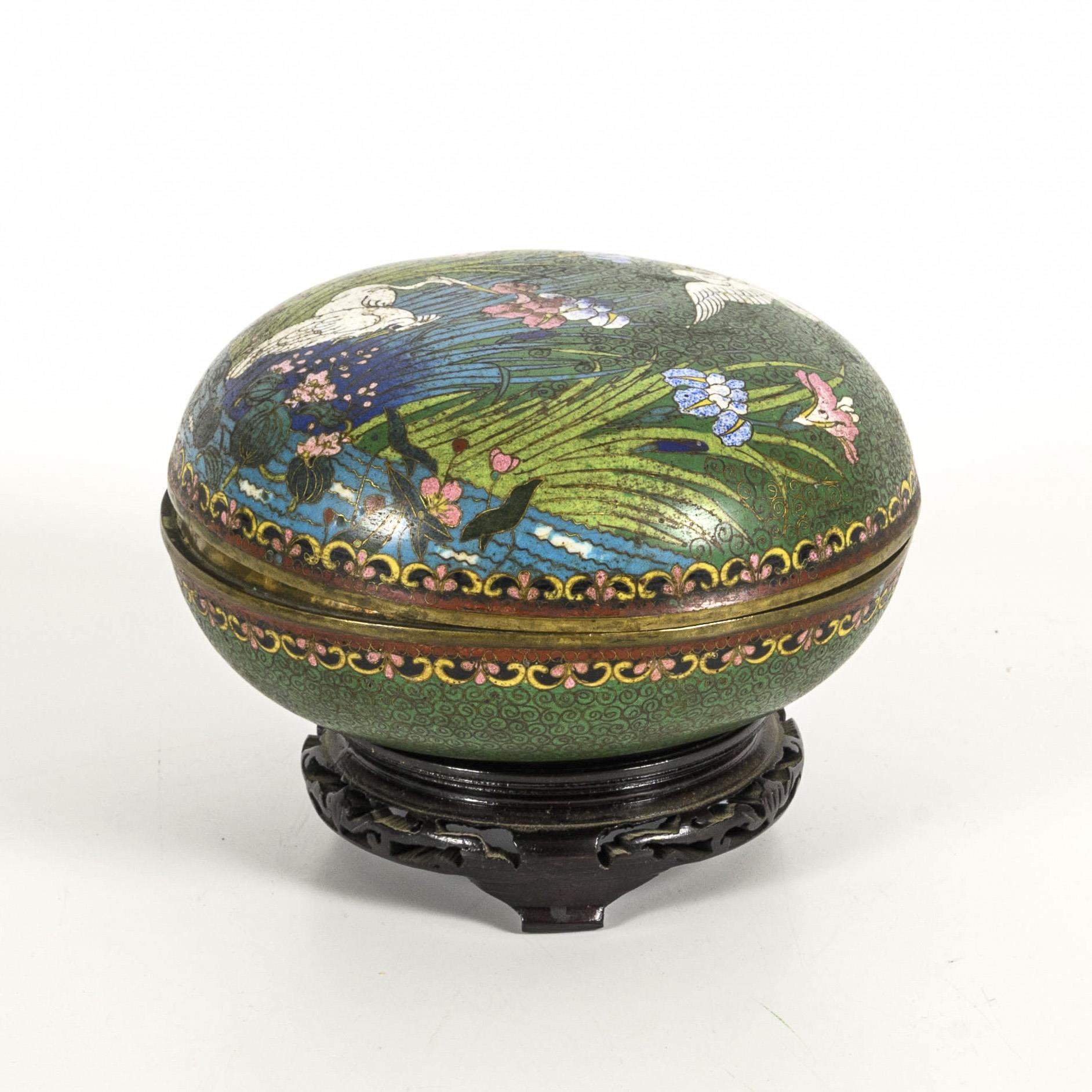 Cloisonné-Dose mit Reihern.