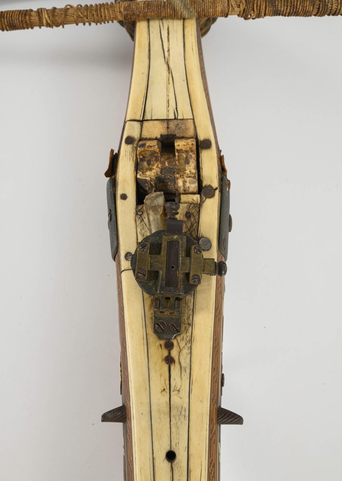 Säule großflächig mit Bein belegt, seitlich florale Beinintarsien und Blockbandintarsien. Auf dem Schaft die gravierte Nummer "37". An der Stirnseite des Kolbens (Kolbenkappe) eine gravierte Doppellilie. Mit Visier und Sperrflügel versehen. Dazu ein ergänzter Bolzen. Trockenrisse und Fehlstellen an den Beinplatten. Im Nußbereich aufgeschraubte Metallplatten zur Stabilisierung eines Risses. Mechanik vorhanden. Bolzenhalter abgebrochen.