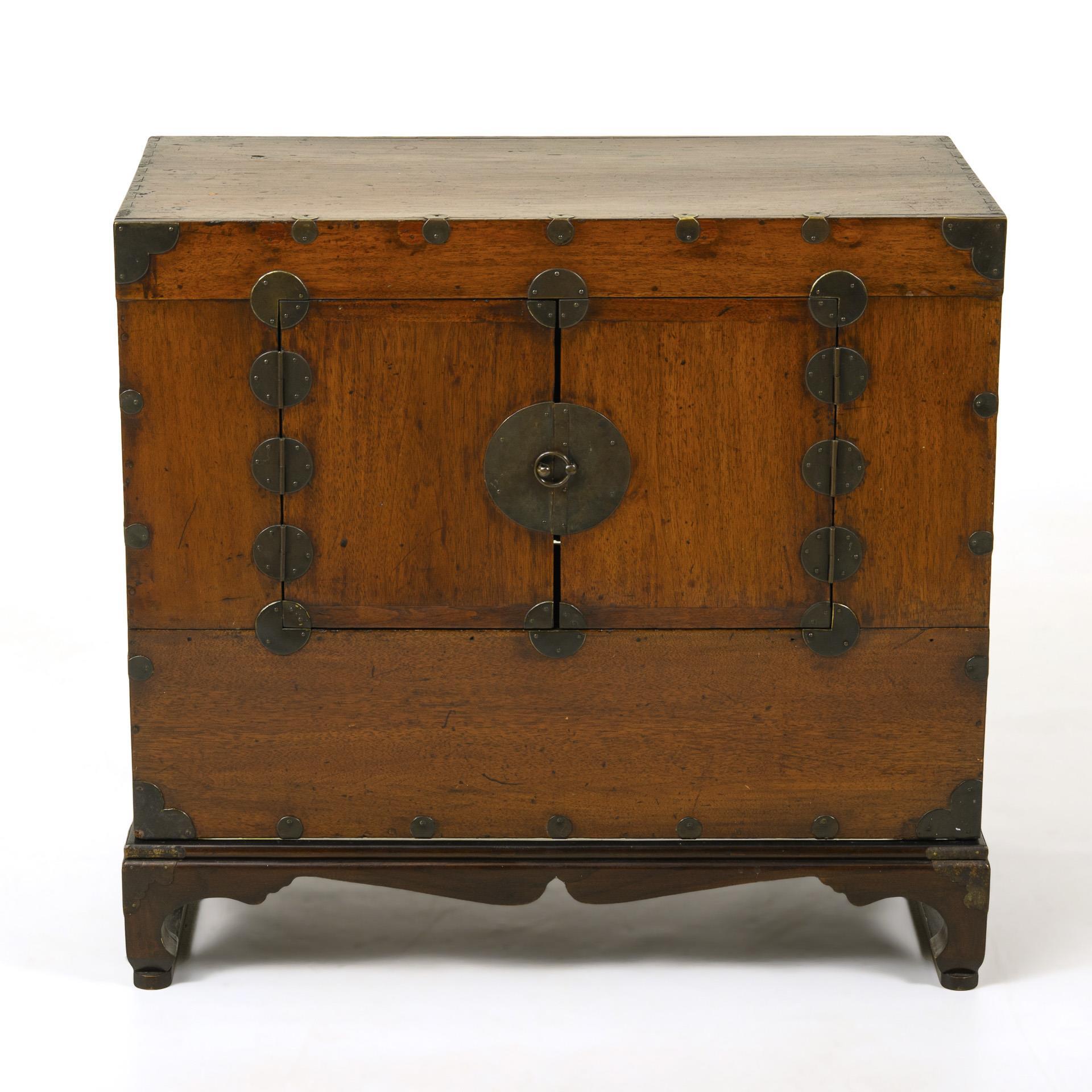 Leichter, schlichter, rechteckiger Korpus mit zwei Türen und runden Beschlägen. Innen keine Untergliederung. Passender Untersatz wohl nicht original dazugehörig. Altersspuren.