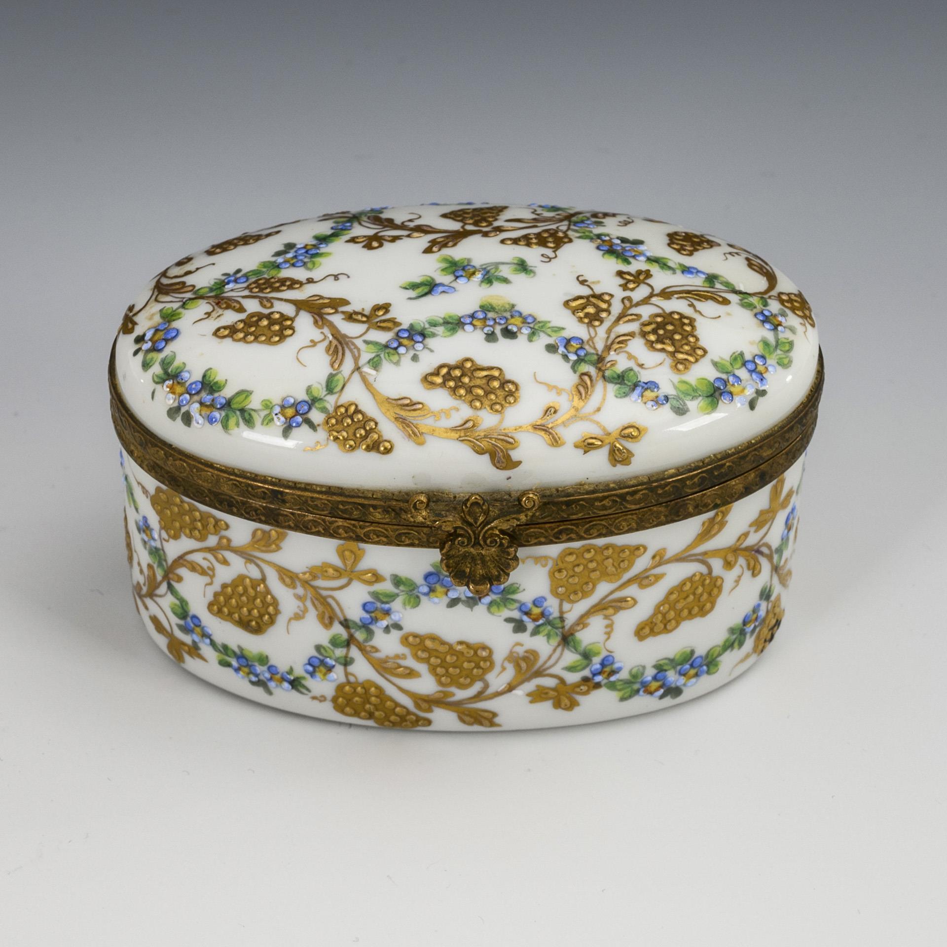Ovale Dose mit metallmontiertem Scharnierdeckel. Auf der Wandung reliefgoldgemalte Weinranken und polychrome Vergißmeinnichtgirlanden mit Emailpünktchen.