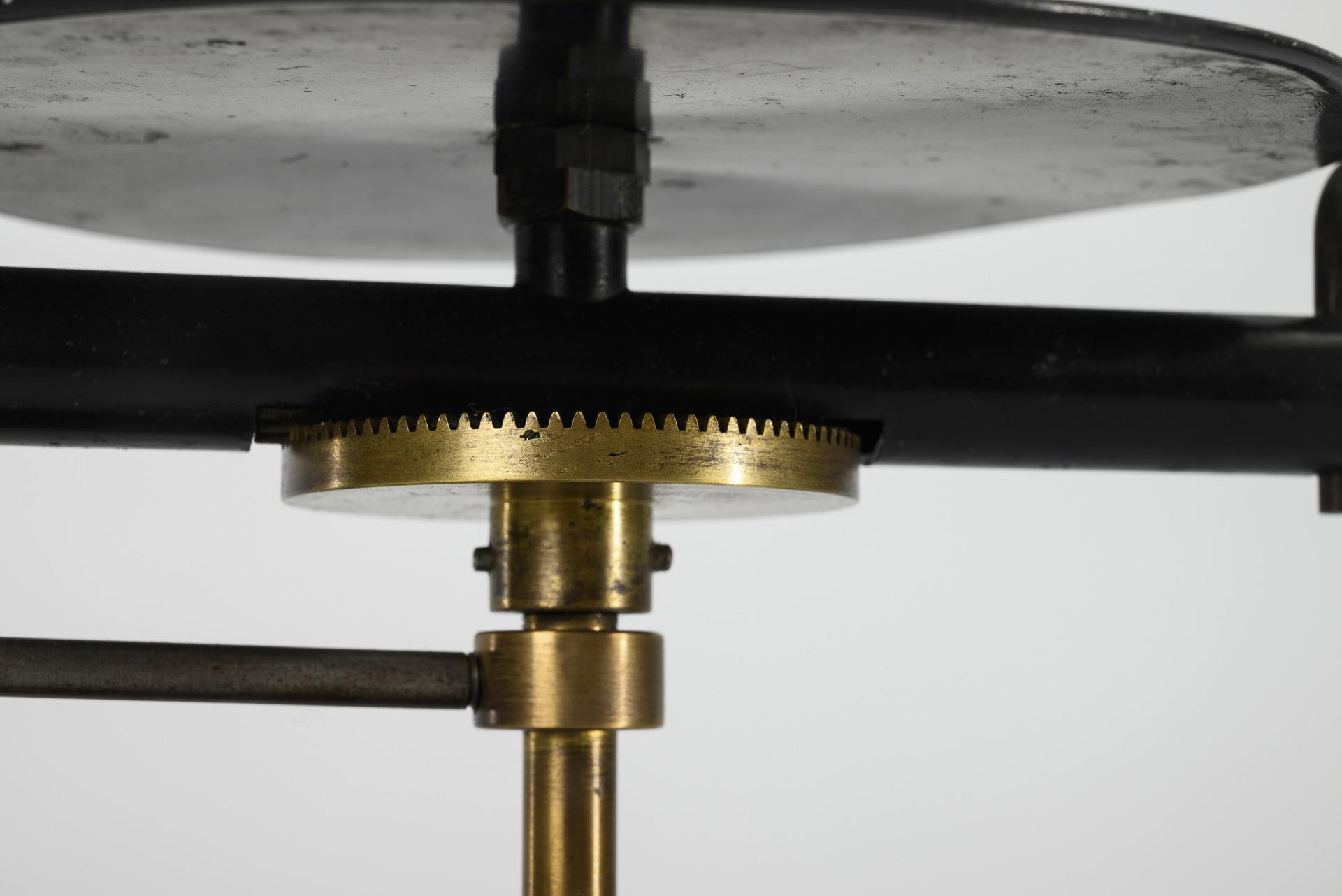Rechteckiger Gusseisenfuß, Schneckenantrieb mit Handrad, Teller mit Papieretikett: Himmelsrichtungen, Jahreszeiten, Monate, Tage, Sternzeichensymbole und -benennungen sowie Gradeinteilungen. Aufgeschraubte Messing-Kerzenhalterung sowie -spiegel. Um den rotierenden Globus sich drehender Messing-Mond. Funktioniert. Alters-/Gebrauchsspuren, Pfeiler restauriert.