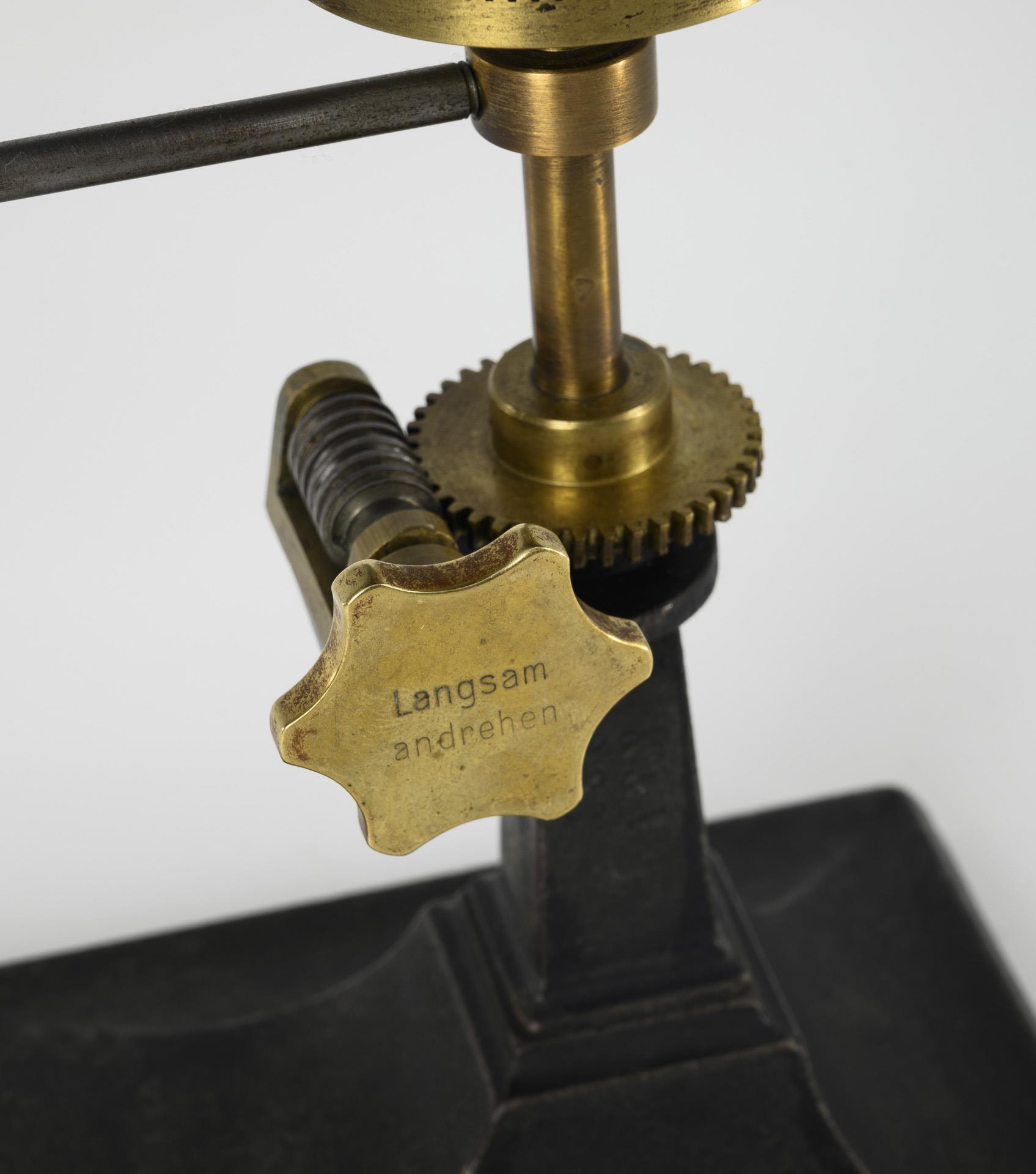 Gusseisen, Messing teils schwarz lackiert, Pappe mit Farblithografie. Nadelholz mahagonifarben gebeizt und mattiniert. H 39 cm, gesamt 149 cm. Gesamt 10,7 kg.