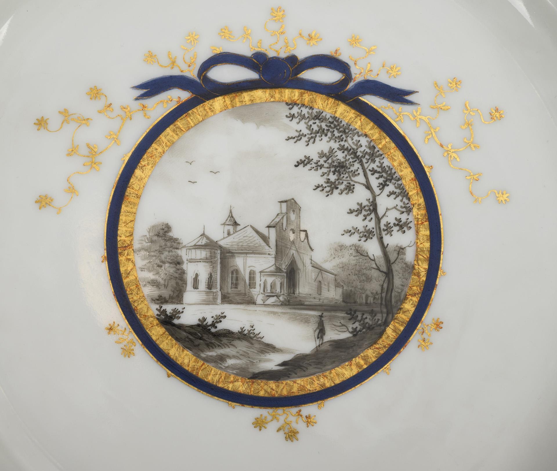 Polygonale Teller mit Perlbandrand. Im Spiegel jeweils ein schleifenbekröntes Medaillon mit einer grisaillegemalten Ansicht.