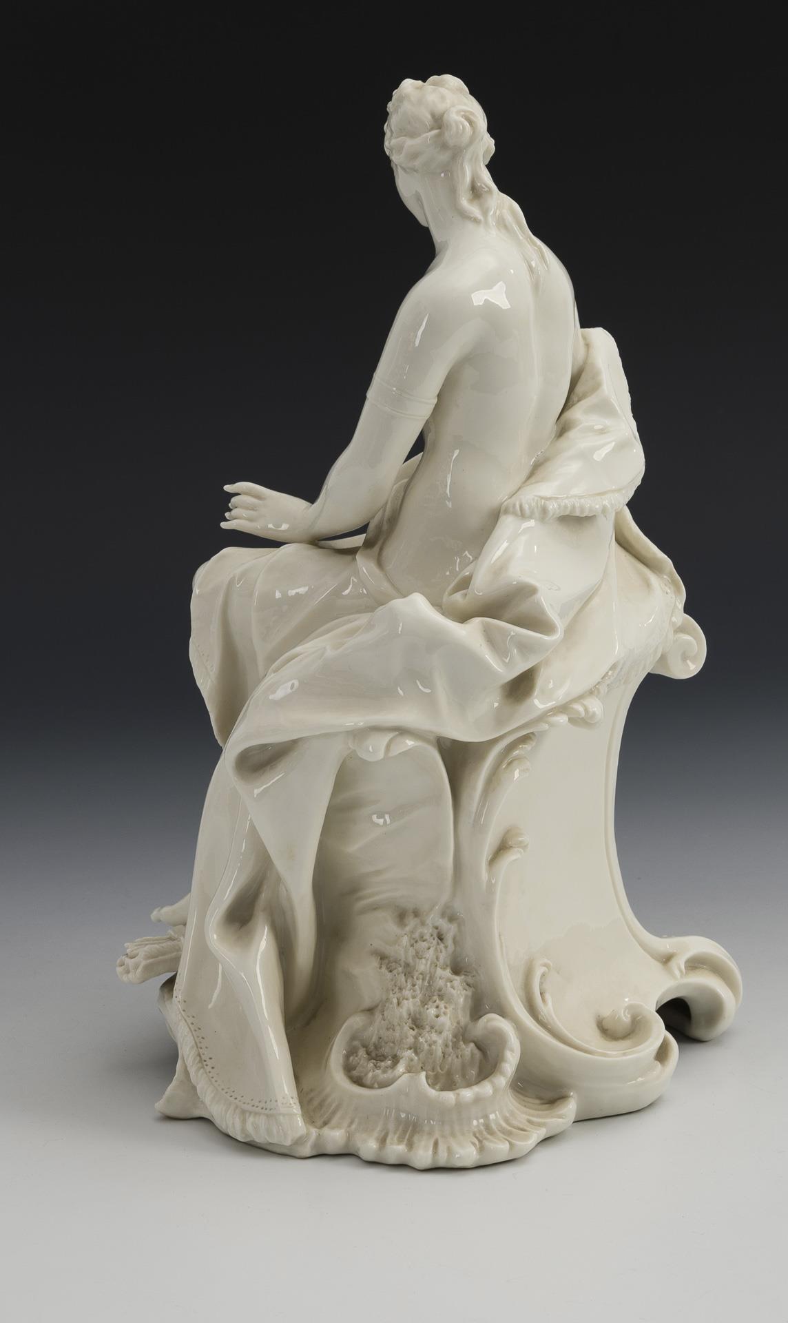 Auf einem Rocaillesockel sitzende Venus mit Bogen und Köcher zu ihren Füßen.