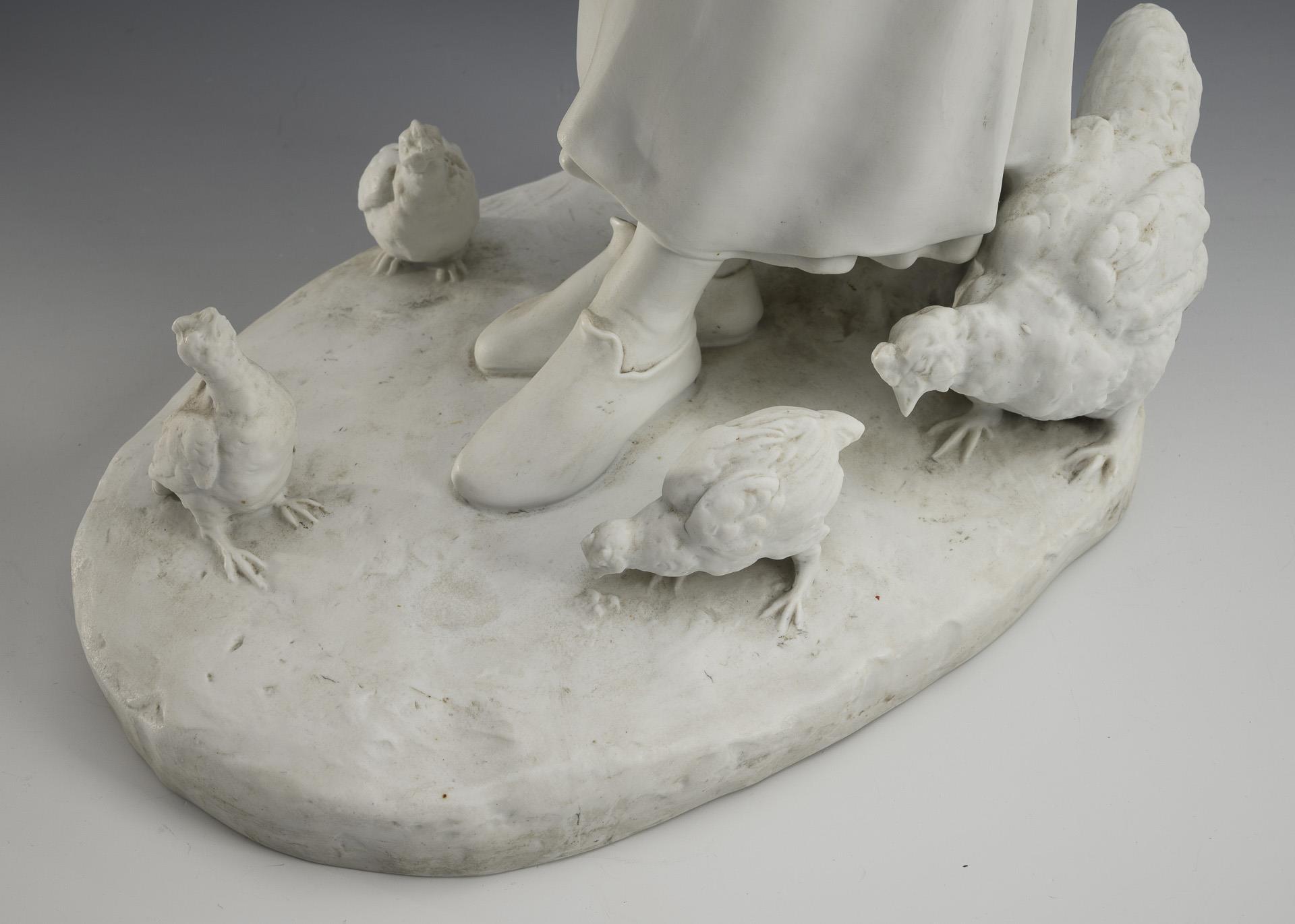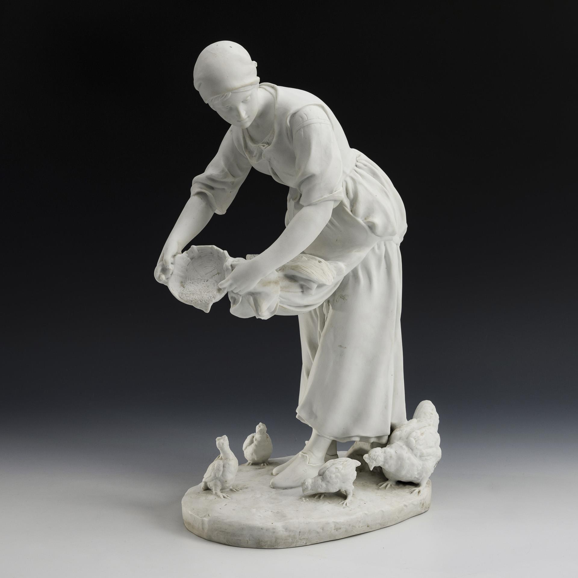 Plastik einer hühnerfütternden jungen Frau. 1 Kükenschnabel minimal bestoßen.