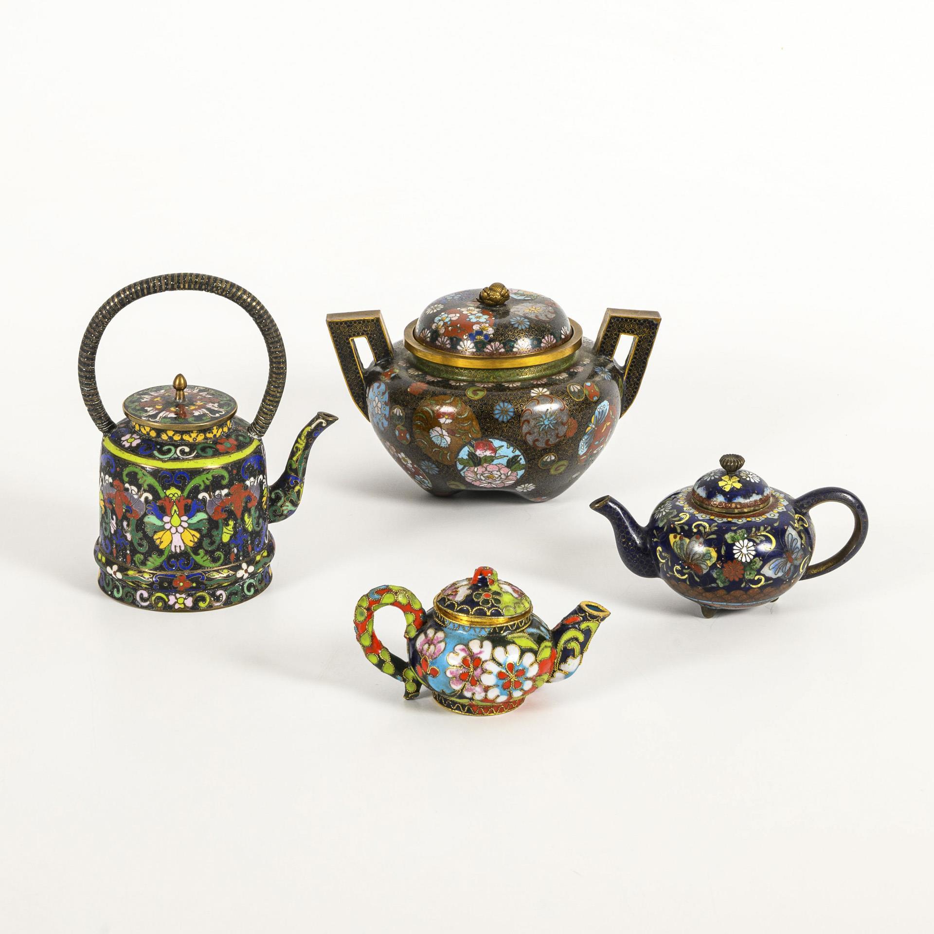 Cloisonné-Konvolut: 3 Teekännchen und eine Dose.