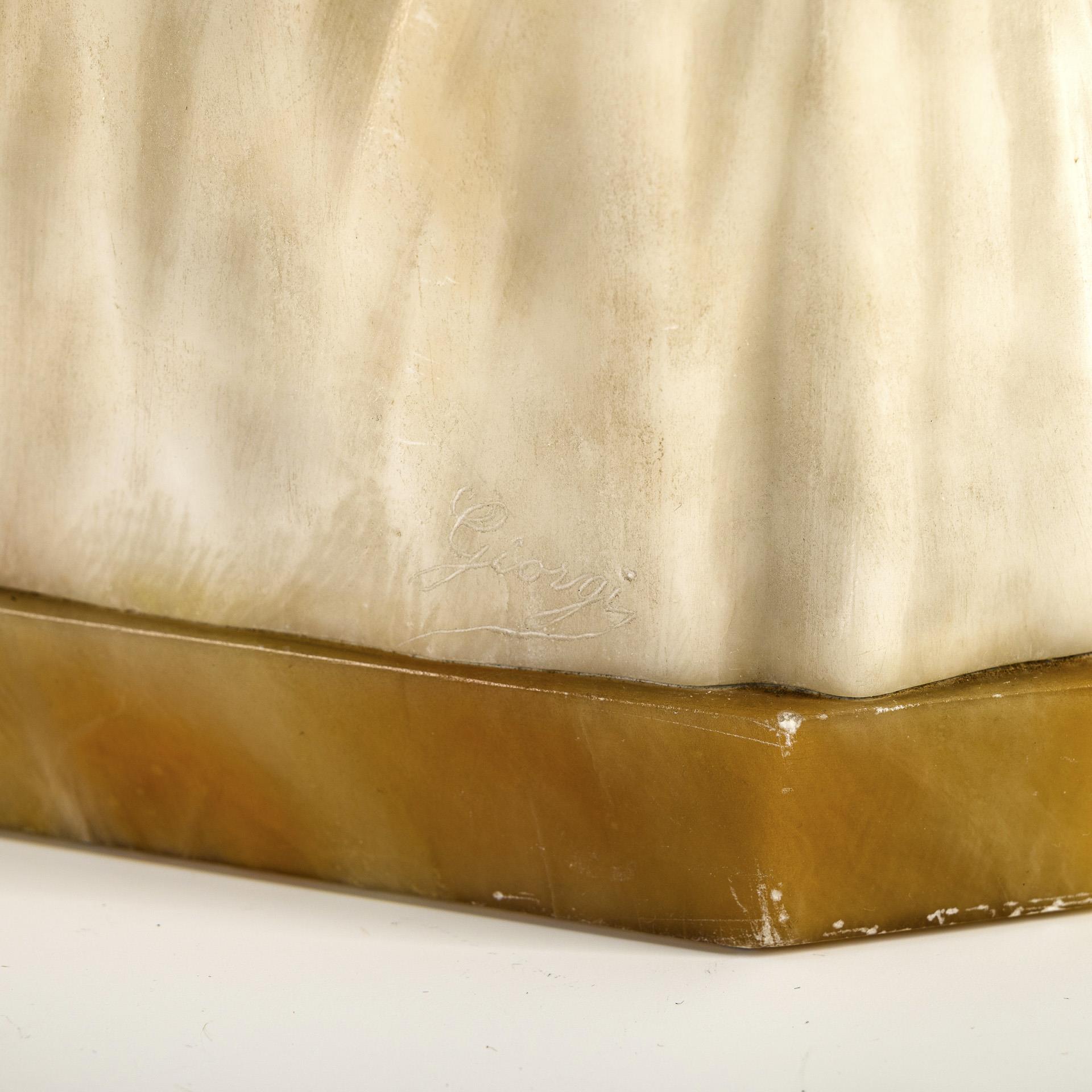 Alabaster, eingefärbte Pupillen, beige Marmor-Plinthe. Anfang 20. Jh. Bezeichnet. H 22,5 / 25 cm. 4,7 kg.