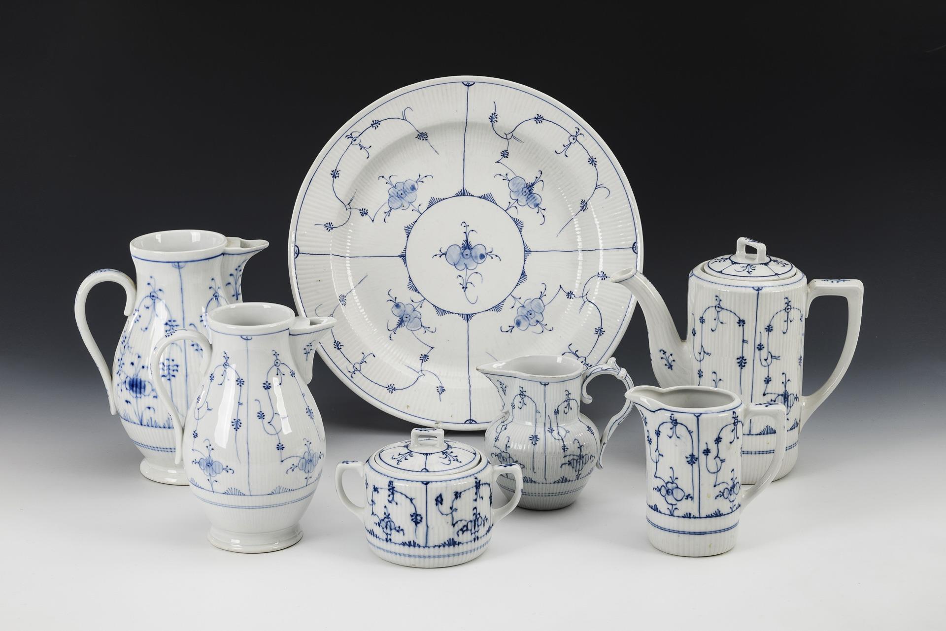 Modell "Gebrochener Stab". Zylinderkanne (H 23 cm), 2 Birnkannen (je ohne Deckel; H 20,5 und 23 cm), 2 verschiedene Kännchen (H 13,5 und 14 cm), 1 Zuckerdose mit ergänztem Deckel (H 11 cm) und 1 Gemüseteller (Ø 36,5 cm).