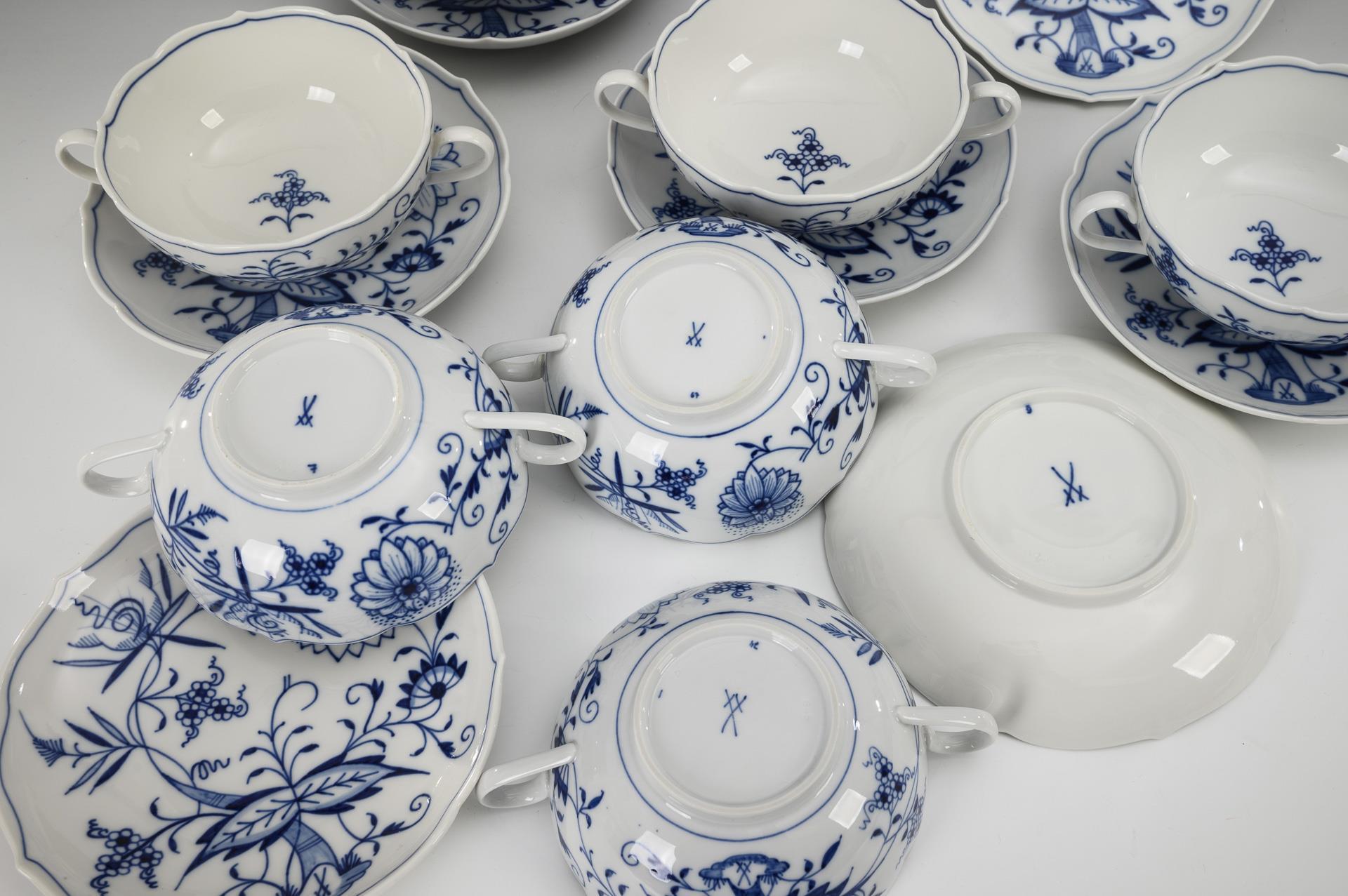 8 Zwiebelmuster-Suppentassen mit Untertassen. Meissen.