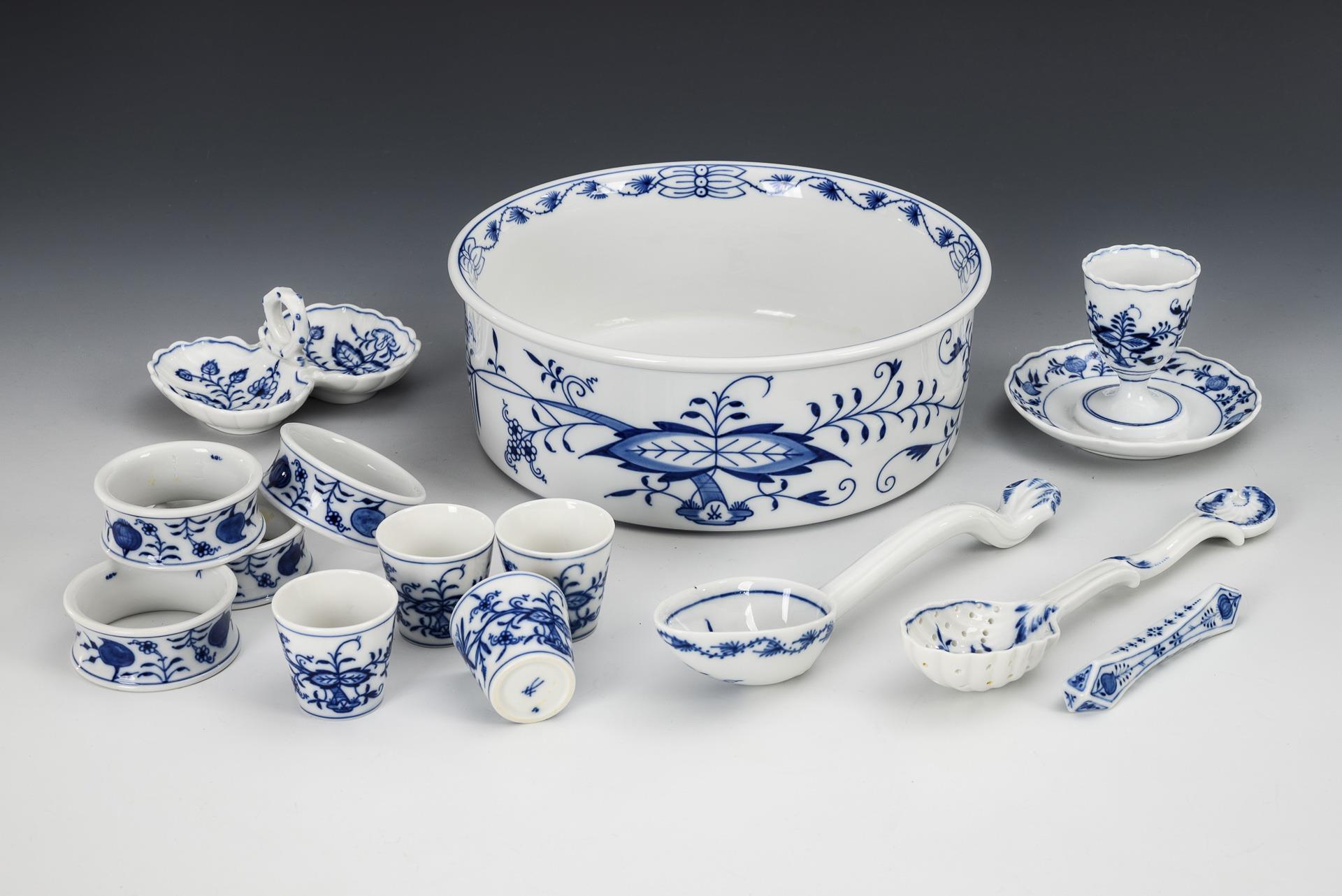 1 Zylinderschüssel (Ø 22 cm), 4 Schnapsbecher (H 4 cm), 4 Serviettenringe (Ø 6 cm), 1 Eierbecher (H 7 cm), 1 Saliere (L 11,5 cm), 1 Messerbänkchen (L 10 cm), 1 Servierlöffel (L 22 cm) und 1 Sieblöffel (L 21,5 cm).