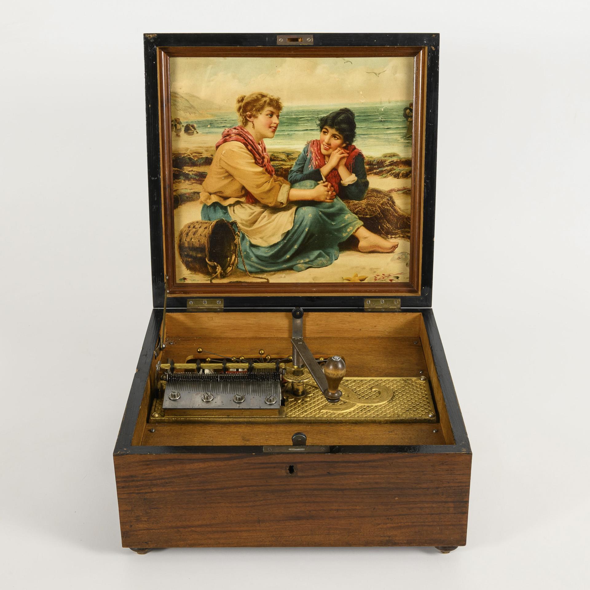 "Spieluhr" mit Stellhebel an der Seite, auf dem Scharnierdeckel "Kalliope"-Gravur in einer Rahmung aus Bein-Fadeneinlagen, im Deckel Farblithografie: Frauen am Strand. Goldbronzierte Gusseisen-Grundplatte mit Jugendstil-Blättern, Werk mit geschlitzter Achse für die Kurbel, Zentralantrieb und Zungenkamm sowie ausschaltbares Glockenspielwerk mit 10 Glocken. Funktioniert, einige Alters-/Gebrauchsspuren am Gehäuse.