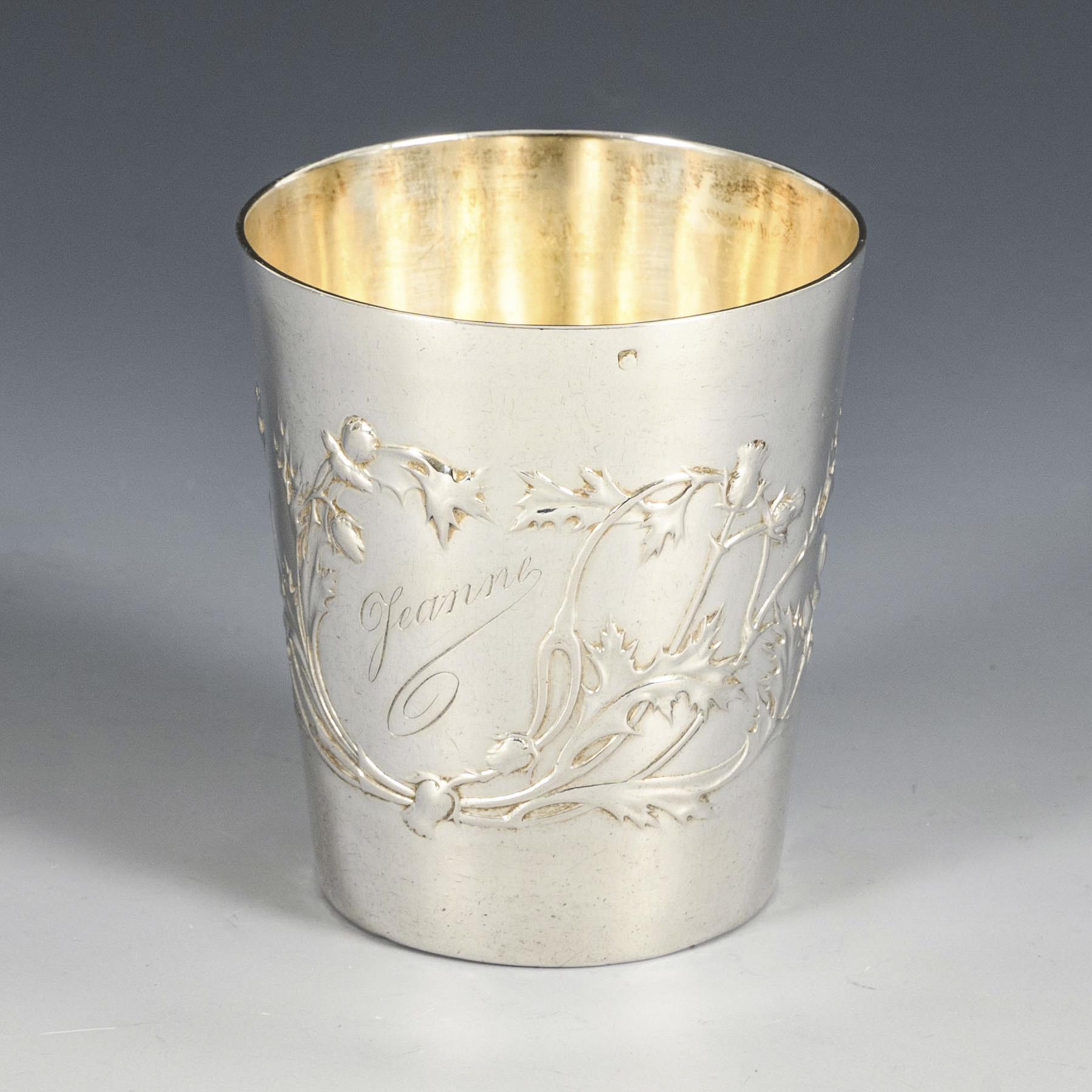 Konischer Becher mit reliefiertem Distelmotiv und Namensgravur "Jeanne". Kleine Dellen, innen Lötspuren.