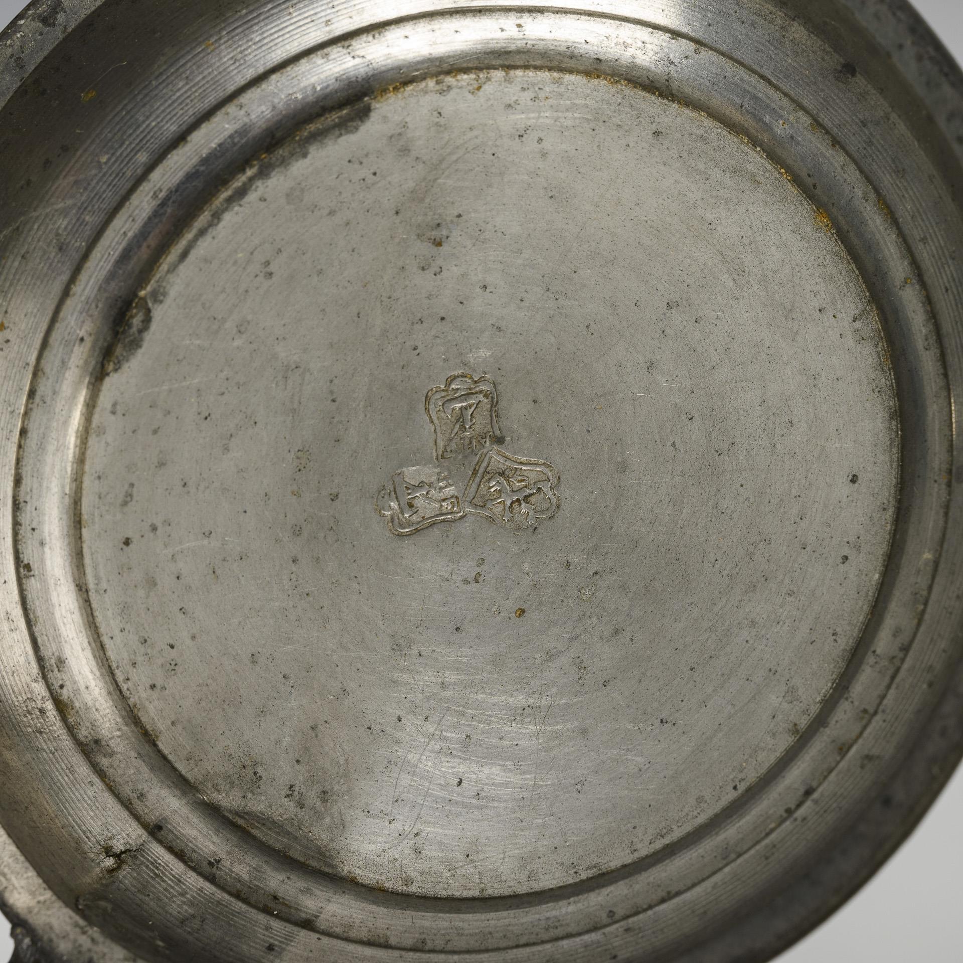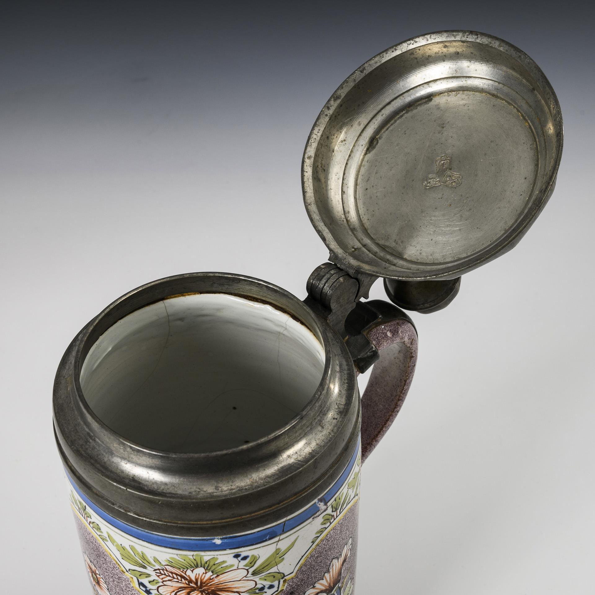 Zylindrischer Korpus mit Bandhenkel, schauseitig 3 Vierpassreserven mit Blütenzweigen und floraler Rahmendekor. Profilierter Zinndeckel mit Kugeldrücker, innen gepunzt, Zinnband und Zinnstand. Leicht rissig, partiell Glasurdefekte.