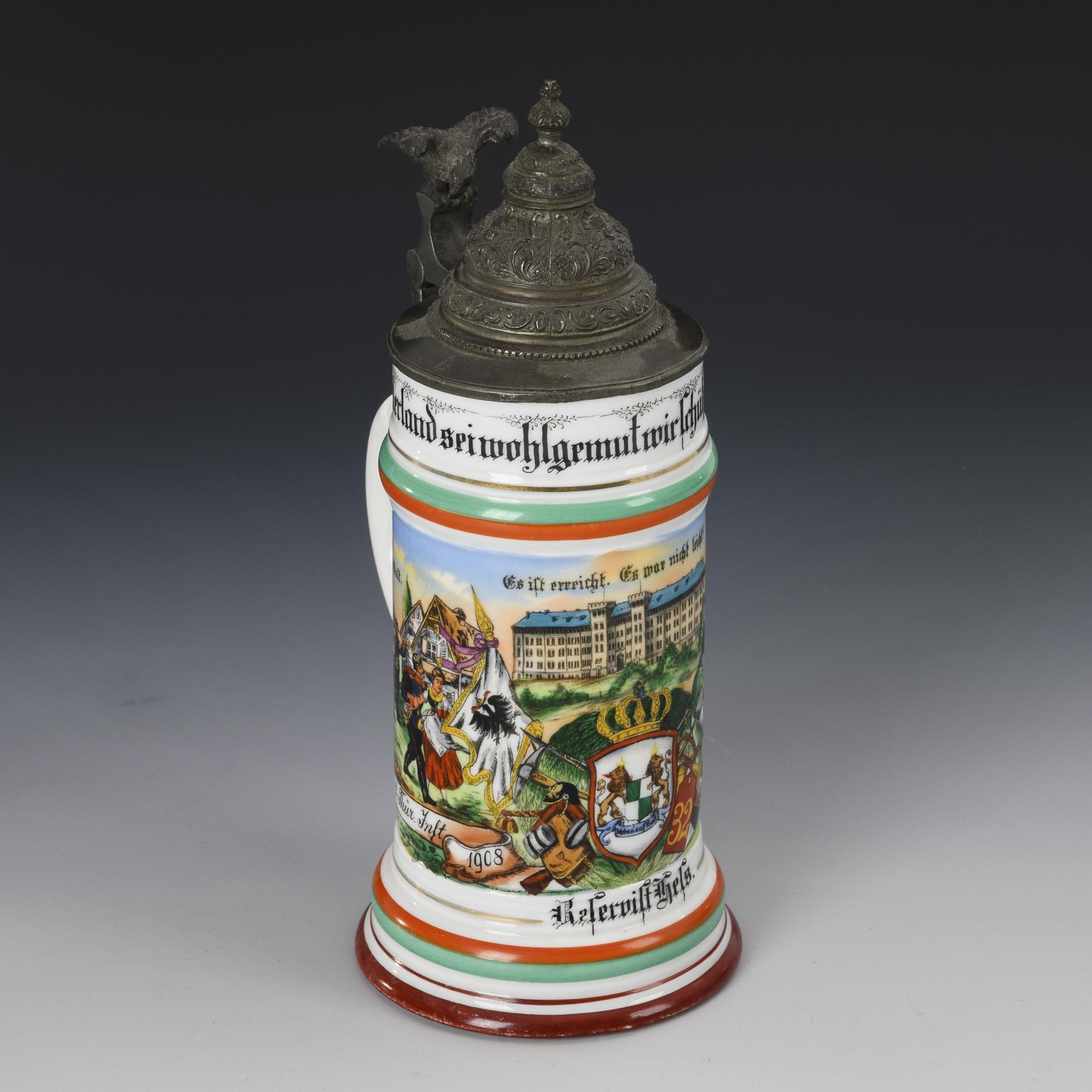 Zentrales Wappen mit Kasernenansicht, "Reservist Hess" "3. Comp. 2. Thür. Inft. Rgt. Nr. 32 Meiningen 1908 - 1910" sowie Namensliste. Zinndeckel mit Adlerdrücker.