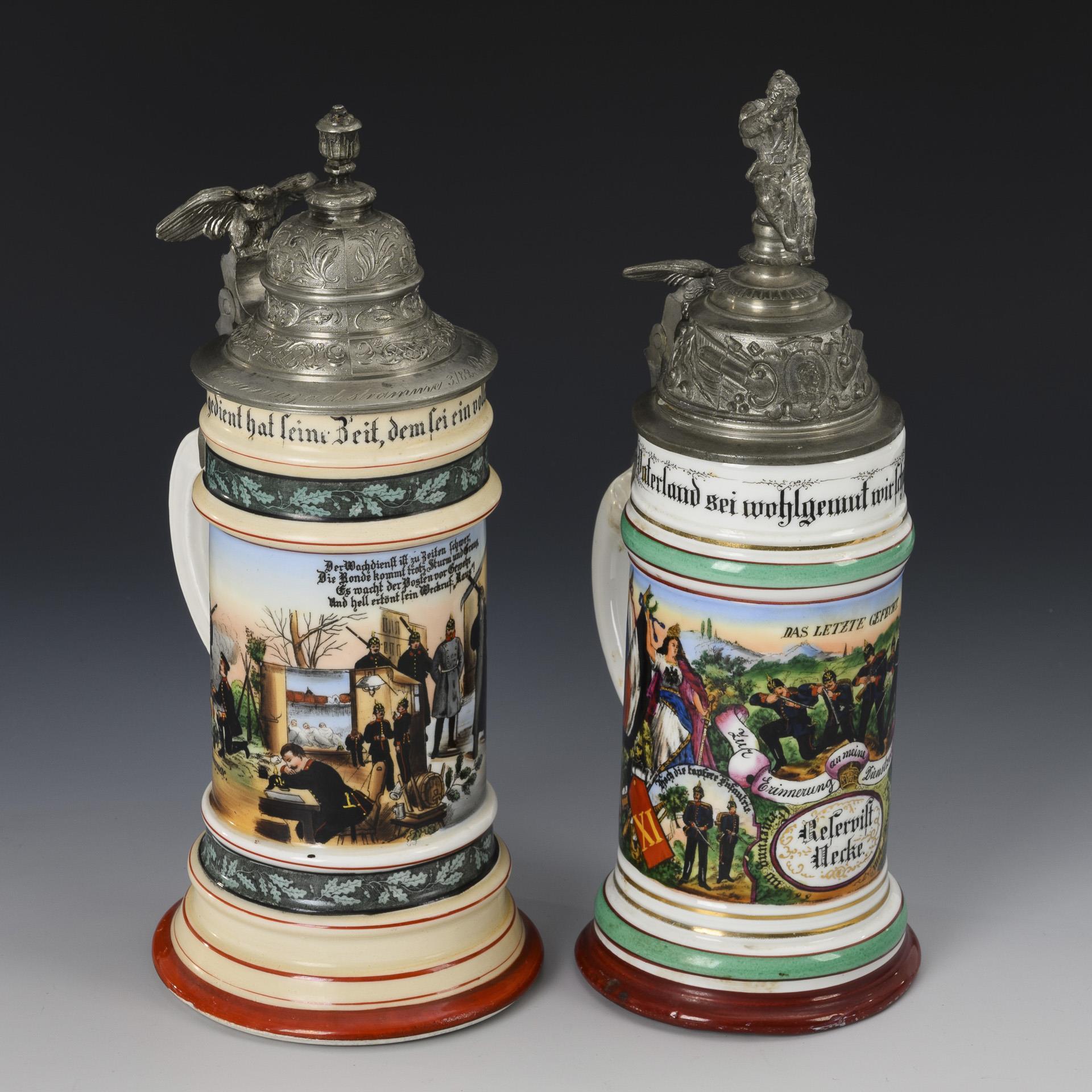 Je gleiche Lithophanie mit Abschiedszene im Boden. Preußischer Krug mit Soldaten und Germania vom Niederwalddenkmal, "Reservist Oecke" "Cassel" mit "XI." auf einem Schulterstück und "1907 / 1909" sowie Namensliste. Deckel mit Adlerdrücker und sitzendem Soldaten als Bekrönung. / Reservistenkrug ohne Namens-/Regimentsnennung und ohne Namensliste; auf dem Zinndeckel mit Adlerdrücker Gravur "3/82 Reservist Geiling" ohne weitere Angaben. 1 Restaurierung am Henkel, sonst minimale Alters-/Gebrauchsspuren.
