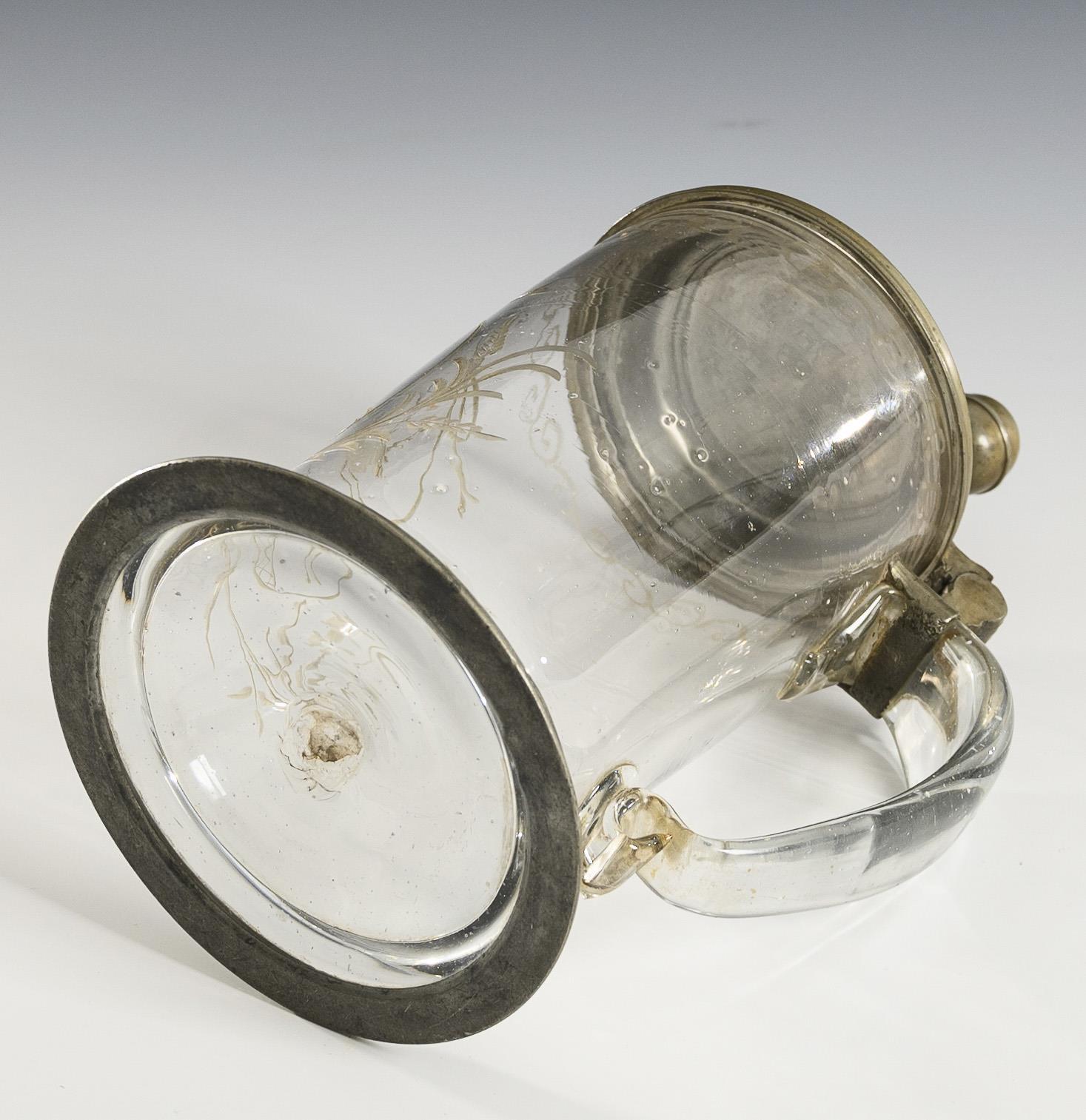 Walzenkrug mit Bandhenkel sowie zinnmontiertem Stand und Scharnierdeckel. Schauseitig das gravierte Motiv eines springenden Hirsches in einem schleifenbekrönten Medaillon.