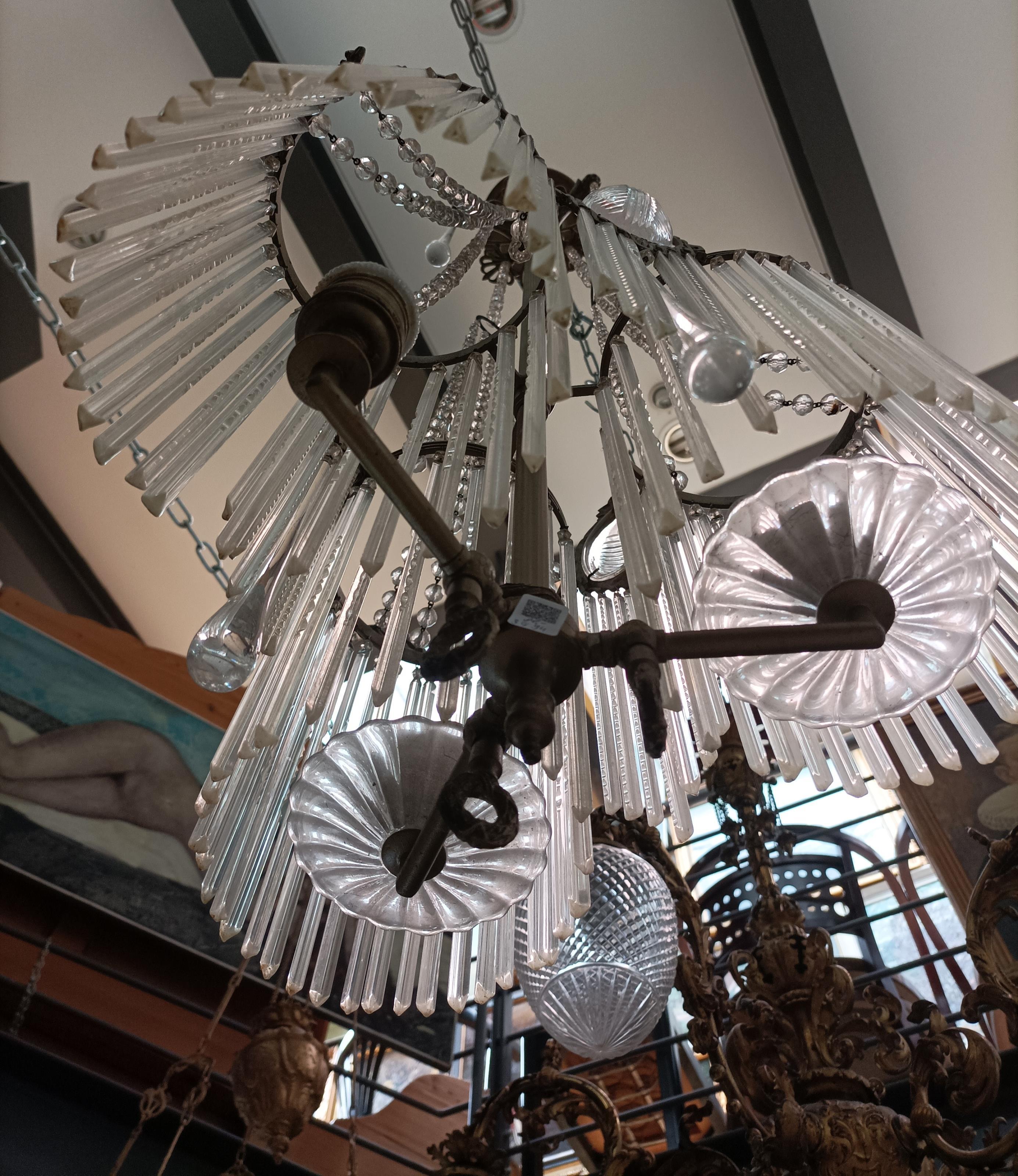 Am geriffelten Zentralschaft abgestrebte Arme mit den Fassungen im walzenförmigen Glasbehang über dreipassigem Grundriss. Unter dem Baldachin eine verzierte Halterung für die abgehängten Glasperlenketten und langen Glastropfen. 1 Glas-Tropfschale fehlt, sonst vollständig, Funktion nicht geprüft.