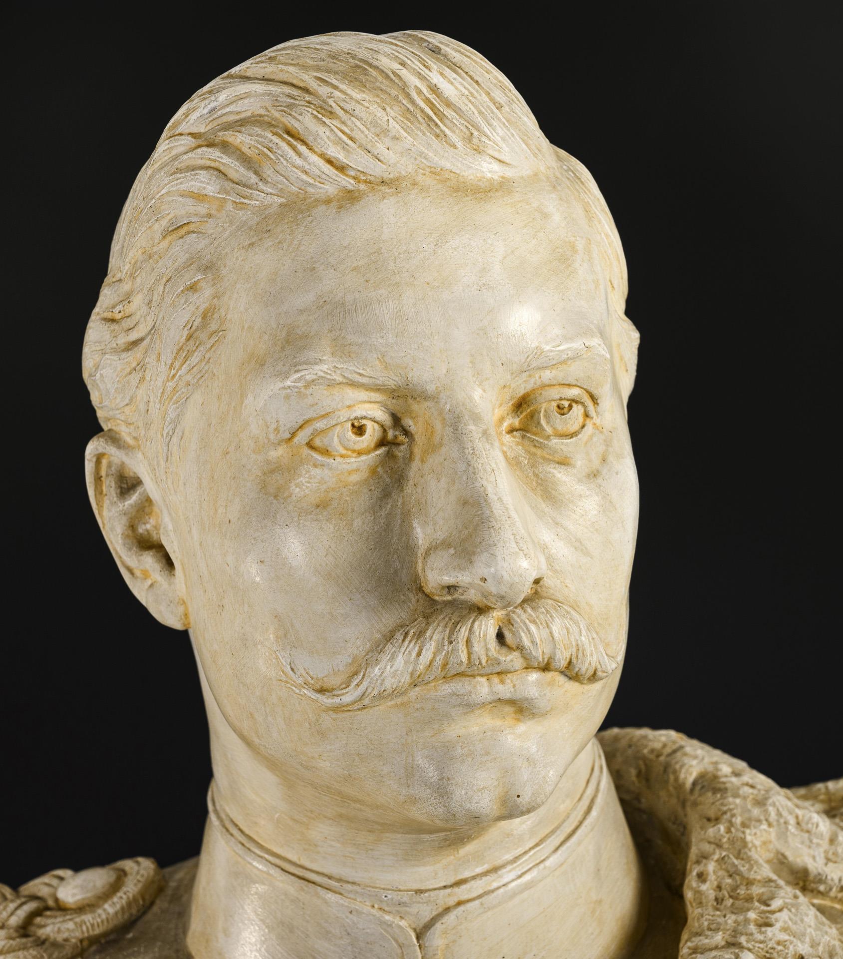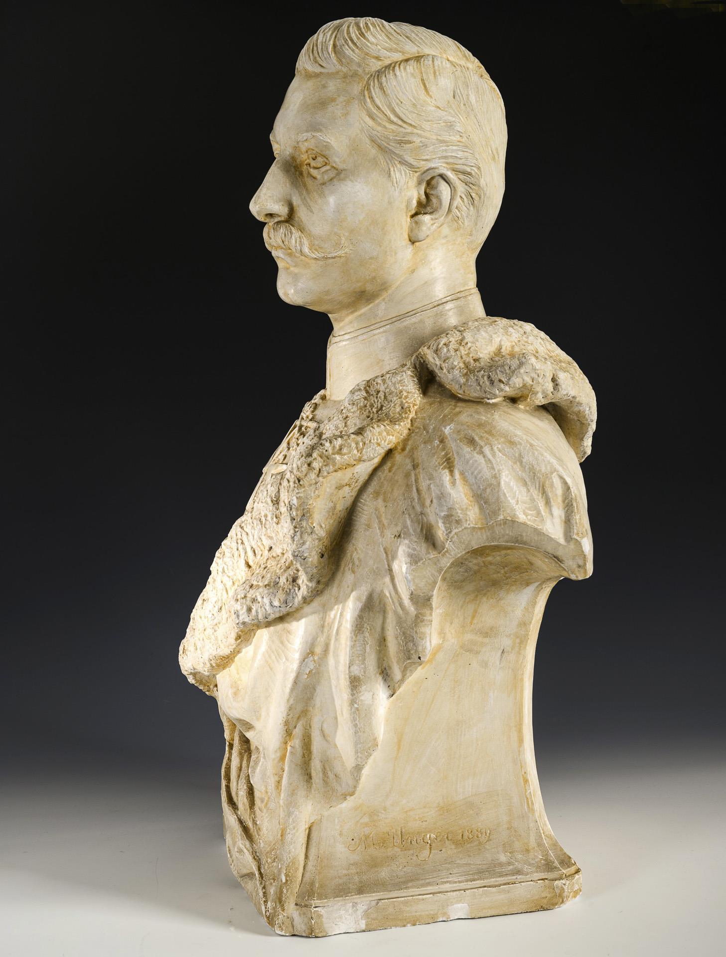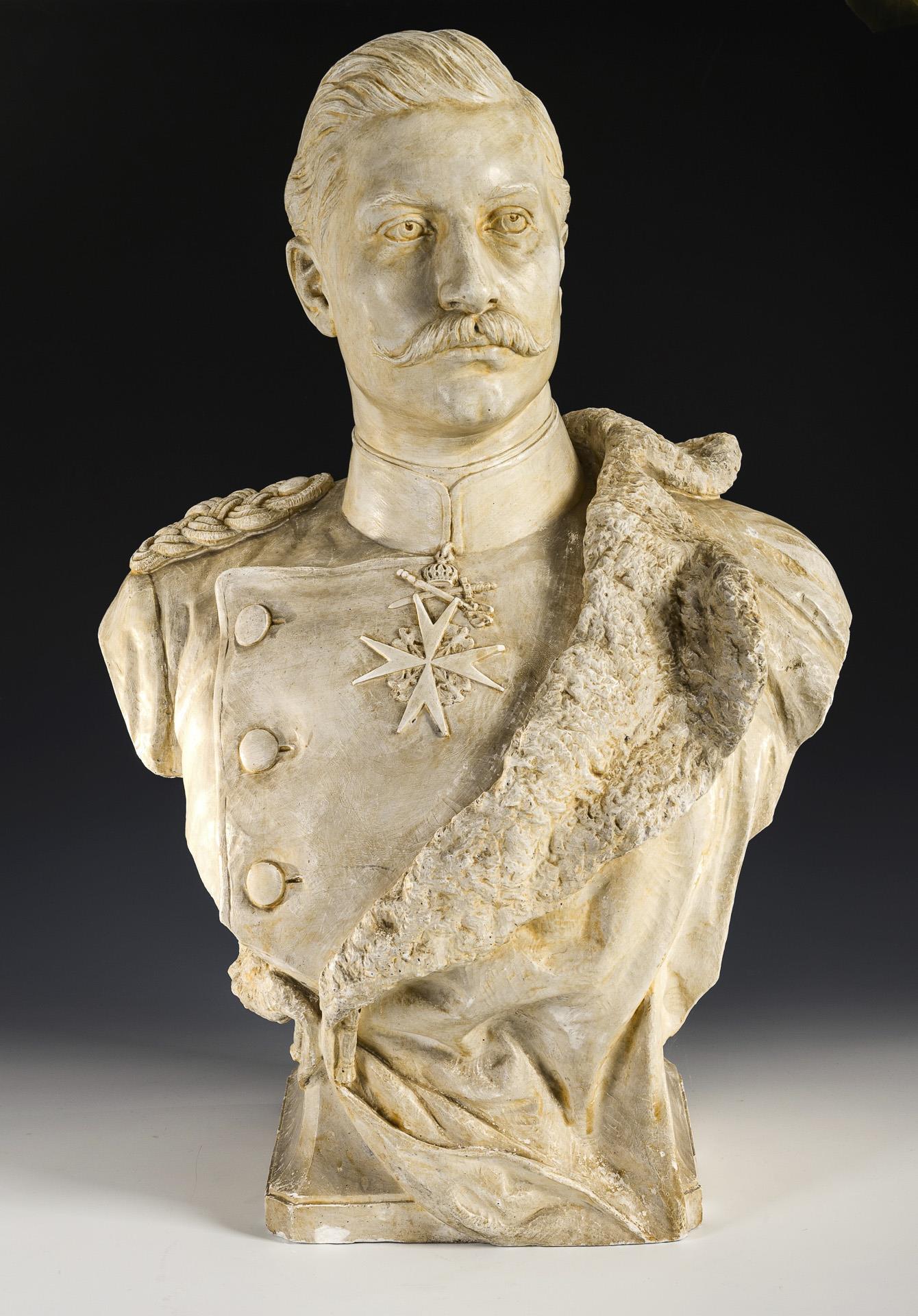 Büste des deutschen Kaisers in Uniform mit Fellmantel sowie Orden am Kragen. Einige Bestoßungen zumeist an der Standfläche.