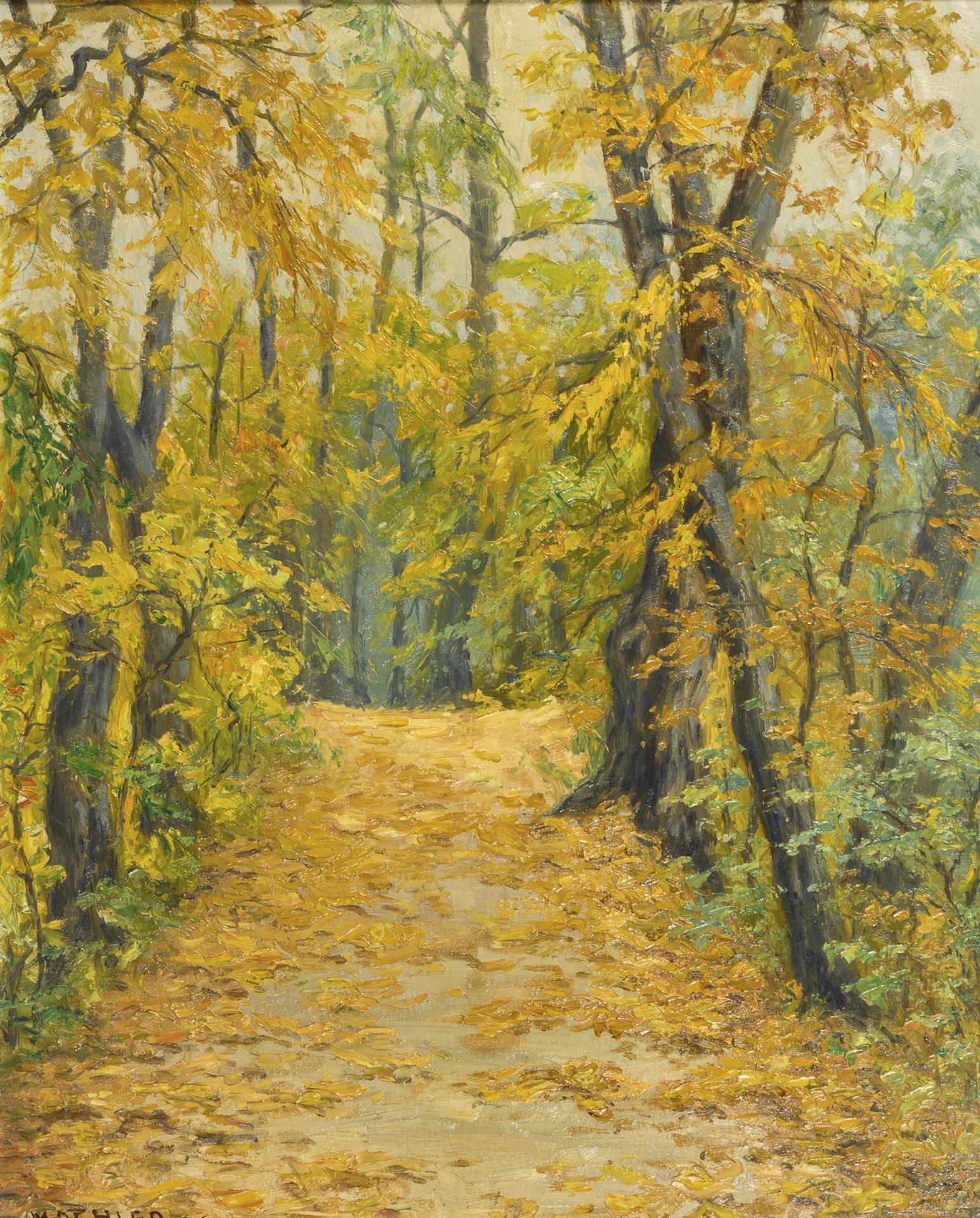 Weggabelung zwischen verfärbten Laubbäumen an einem hellen Tag. Minimale Altersspuren.