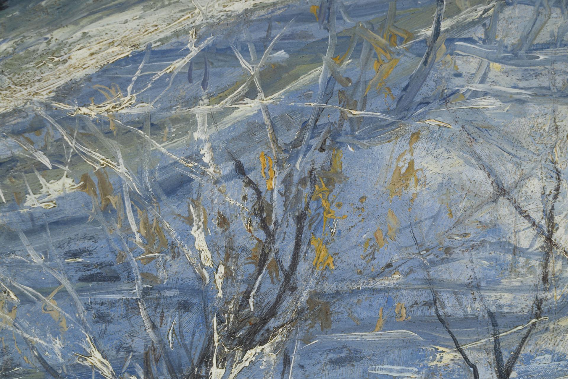 Blick über die Ilm in den verschneiten Park, wohl hinüber zur Karlsmühle an einem hellen Wintertag. Nagellöcher an den Rändern.