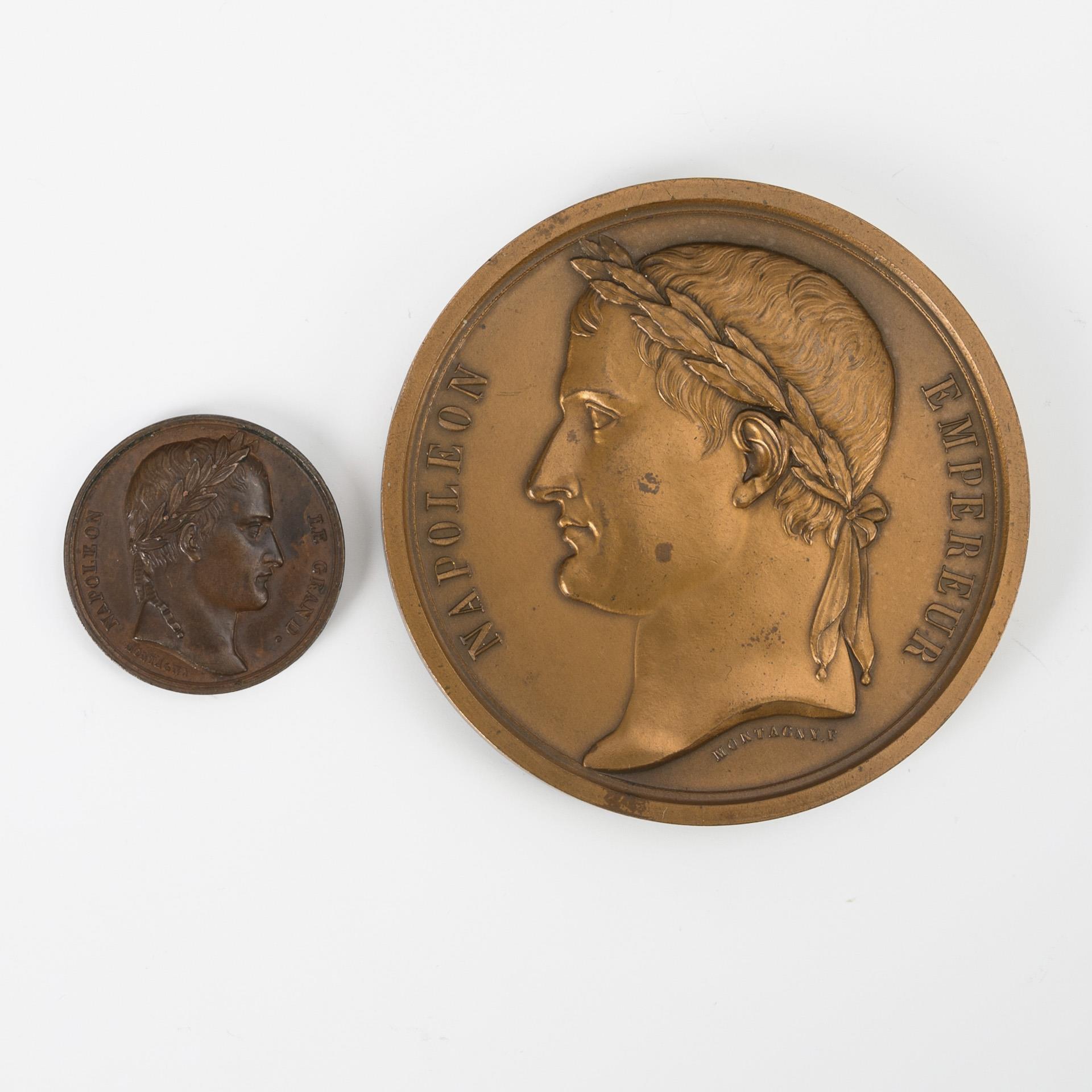 Bildnis "Napoleon Empereur". Rückseitig Prozession/Trauerzuges auf dem Champs-Élysées in Paris vor dem Triumphbogen "Funerailles de l'Empereur 15. D.bre 1840."; je Montagny bezeichnet. Auf dem Rand Bronze gepunzt. Ø 5,9 cm, 121 g. / Kleine Medaille mit dem Bildnis "Napoleon le Grand"; Montagny bezeichnet. Rückseitig Triumphbogen "Al Armee Francaise" "Hauteur 152 P...3 P". Ø 2,6 cm, 9 g. Große geringe, kleine einige Alters-/Gebrauchsspuren.