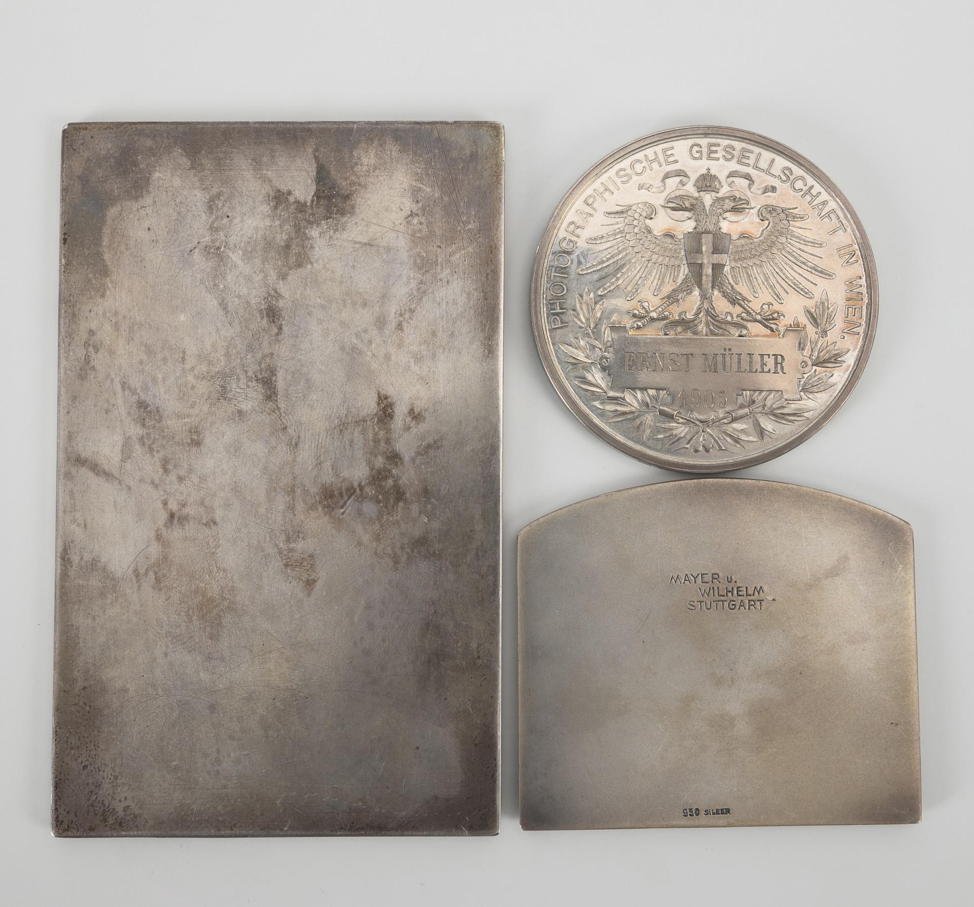 Einseitig reliefierte Hochrechteck-Silberplakette "Oesterreichische-Alpenfahrt 1913 - 22 - 29 - Juni K .K. Oesterreichischer Automobil-Klub". Dianakopf für 950 und Josef Carl von Klinkosch gepunzt. / Beidseitig reliefierte Silbermedaille "Photographische Gesellschaft in Wien" "Ernst Müller 1905"; Entwurf K. Schwenzer. Dianakopf Wien 950 und J.C gepunzt. / Stadtansicht "Den Siegern im 4. Stuttgarter 6-Tage-Rennen 1931. Gewidmet von der Stadt Stuttgart". "950 Silber" und "Mayer u. Wilhelm Stuttgart" gepunzt.