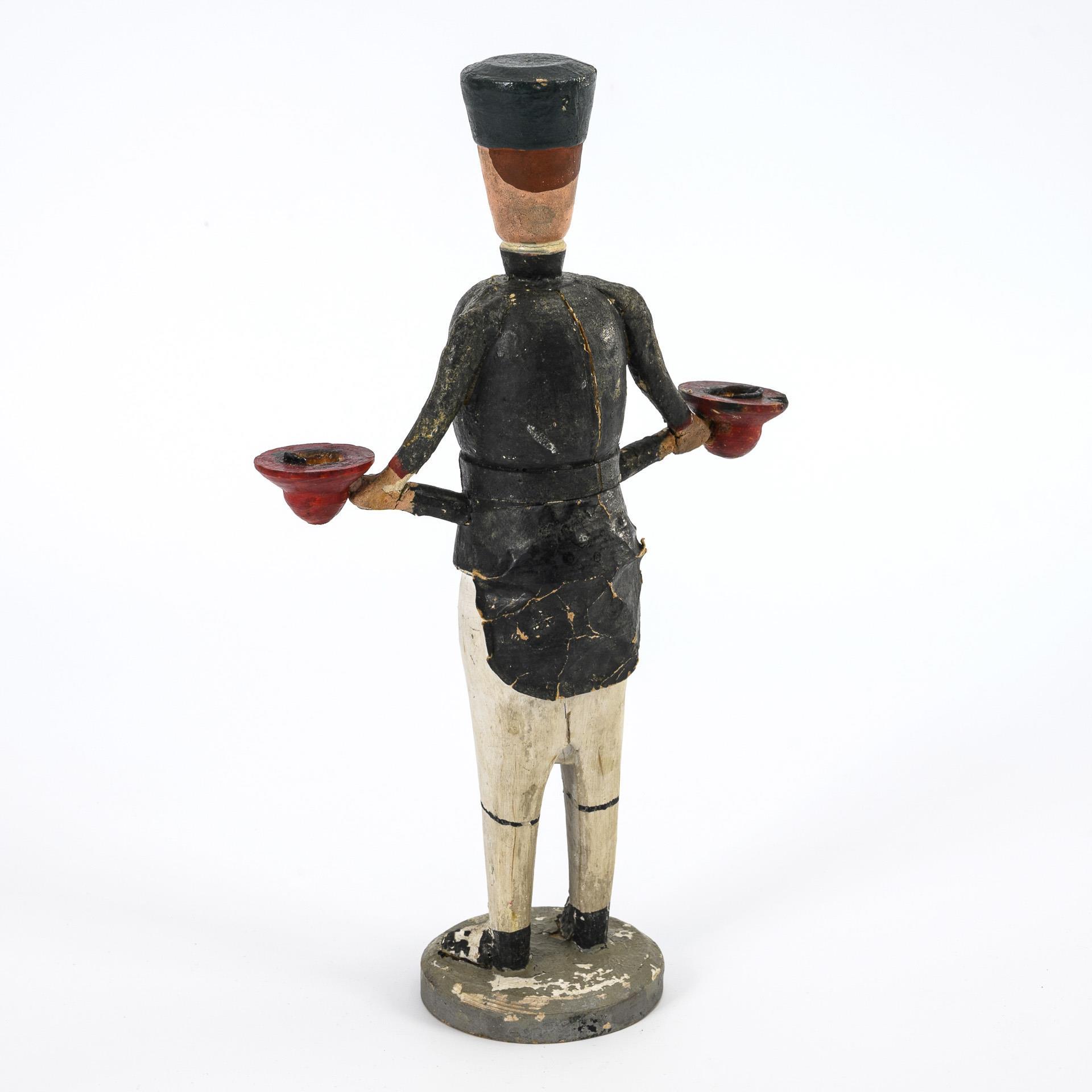 Wohl Ernst Bolvierer, Großolbersdorf. Leuchtermann in schwarz-weißer Uniform, mit 2 Kerzentüllen. Alters- und Gebrauchsspuren, Trockenrisse.