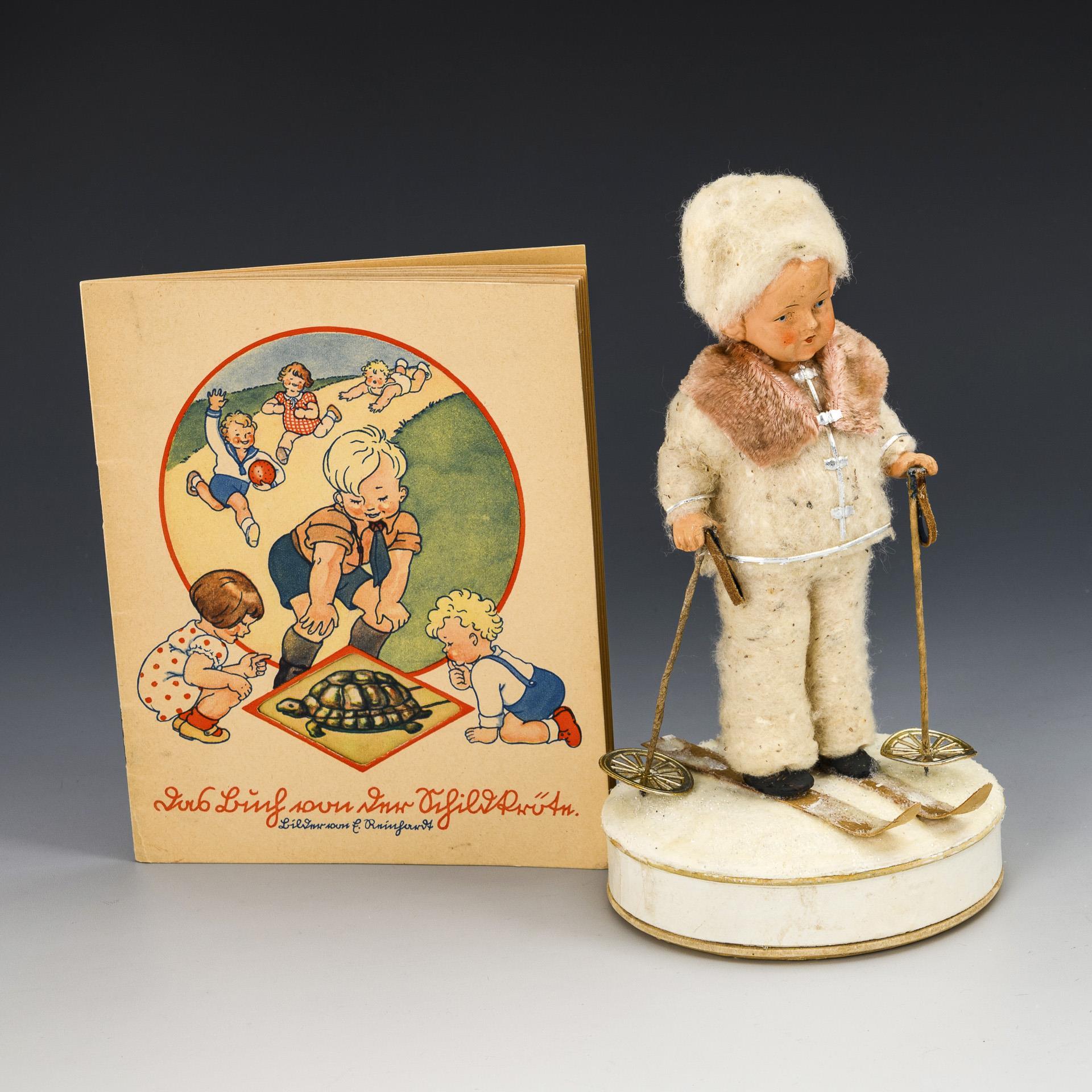 Winterkind mit weißer Wattekleidung und Pappski, auf runder Box mit Schneegrieß stehend. / Dazu Heftchen "Das Buch von der Schildkröte", 17 x 13,7 cm. Leichte Altersspuren.