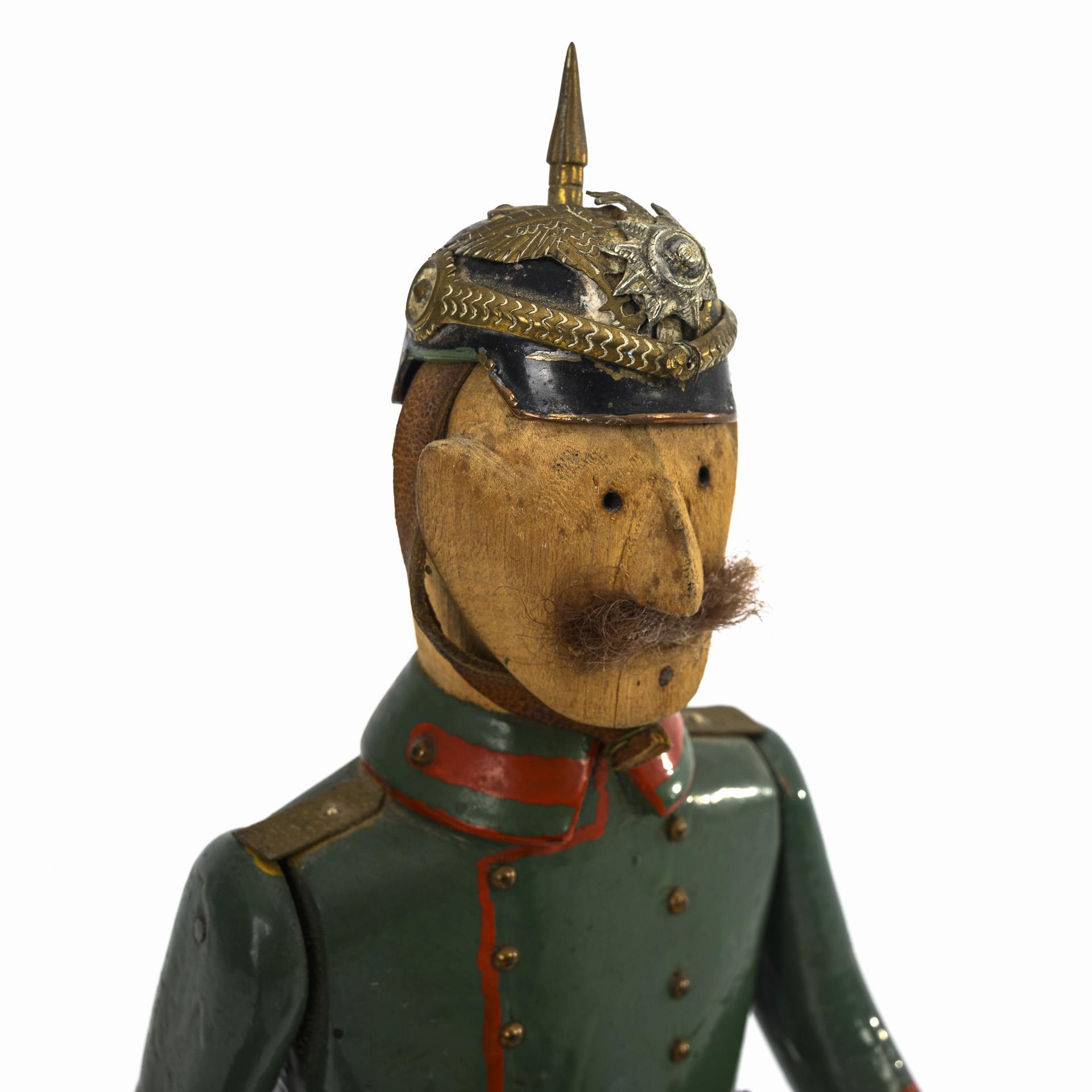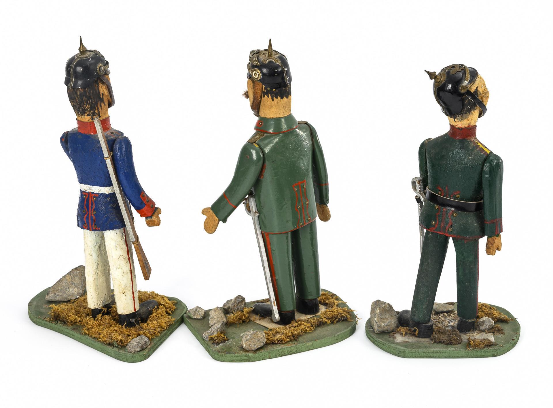 Geschnitzte Soldatenfiguren mit beweglichen Armen. 2x in grüner, 1x in blauer Uniform. Jeweils auf flacher Sockelplatte mit Moos und Steinen. Altersspuren, partiell nachgefasst.