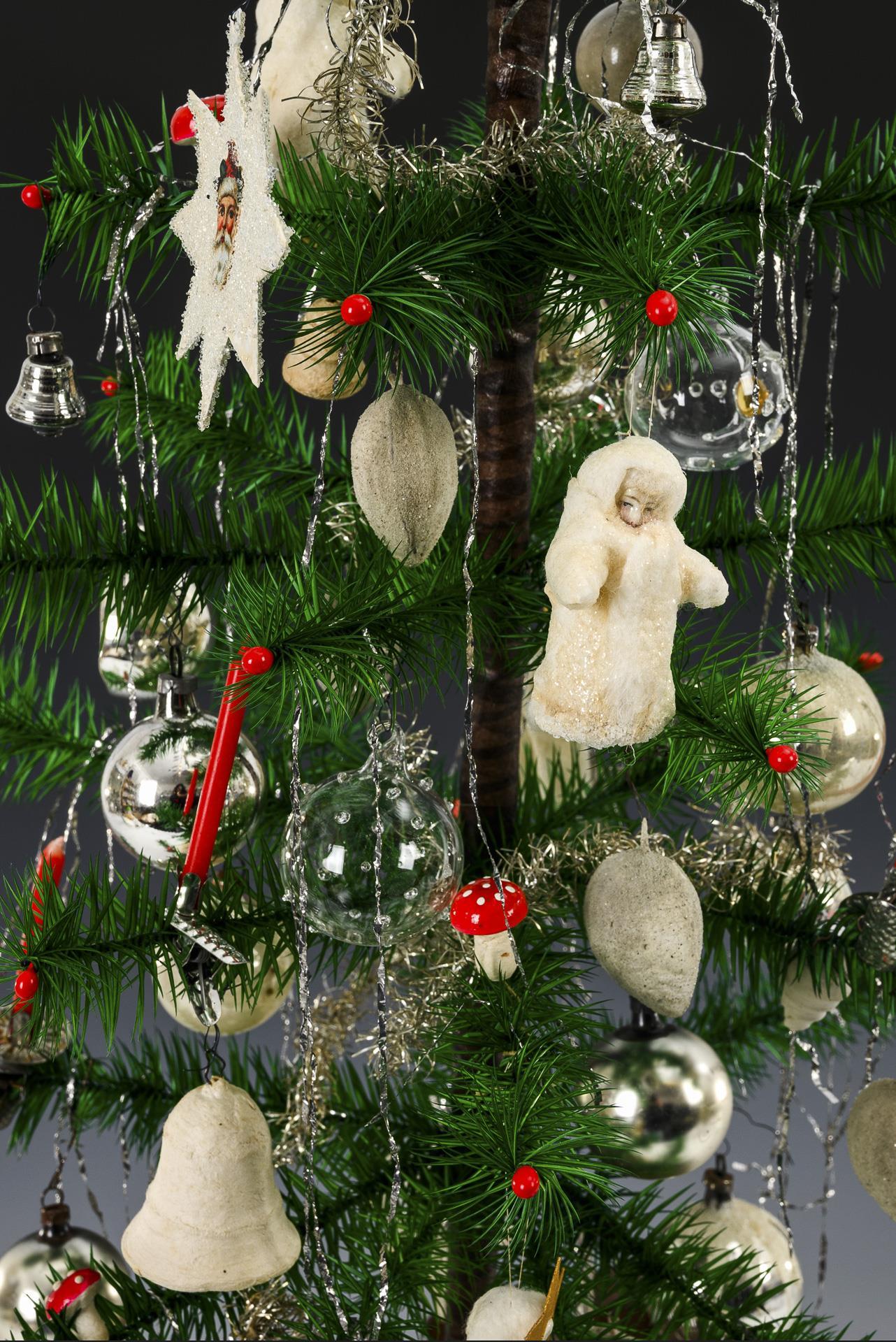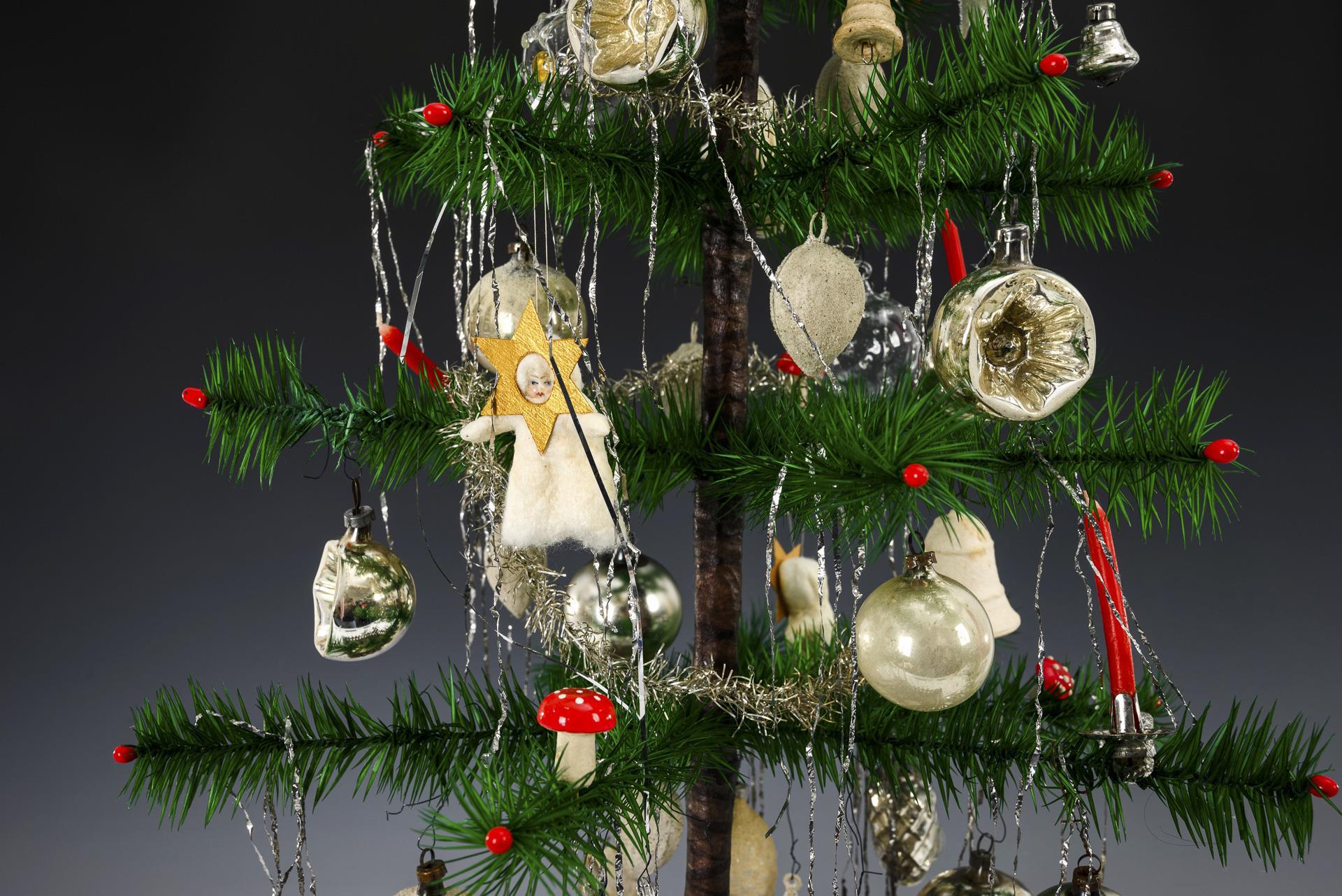 Federbäumchen mit Schmuck aus Watte und Glas. Auf quadratischem Baumständer mit Gartenzaun. Teils mit Altersspuren.