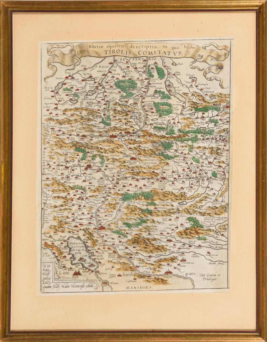 Landkarte der Grafschaft Tirol, bezeichnet: "Rhetiae alpestris descriptio, in qua hodie Tirolis Comitatus"; aus "Theatrum Orbis Terrarum", verso Beschreibung in Latein. Blatt wohl beschnitten.