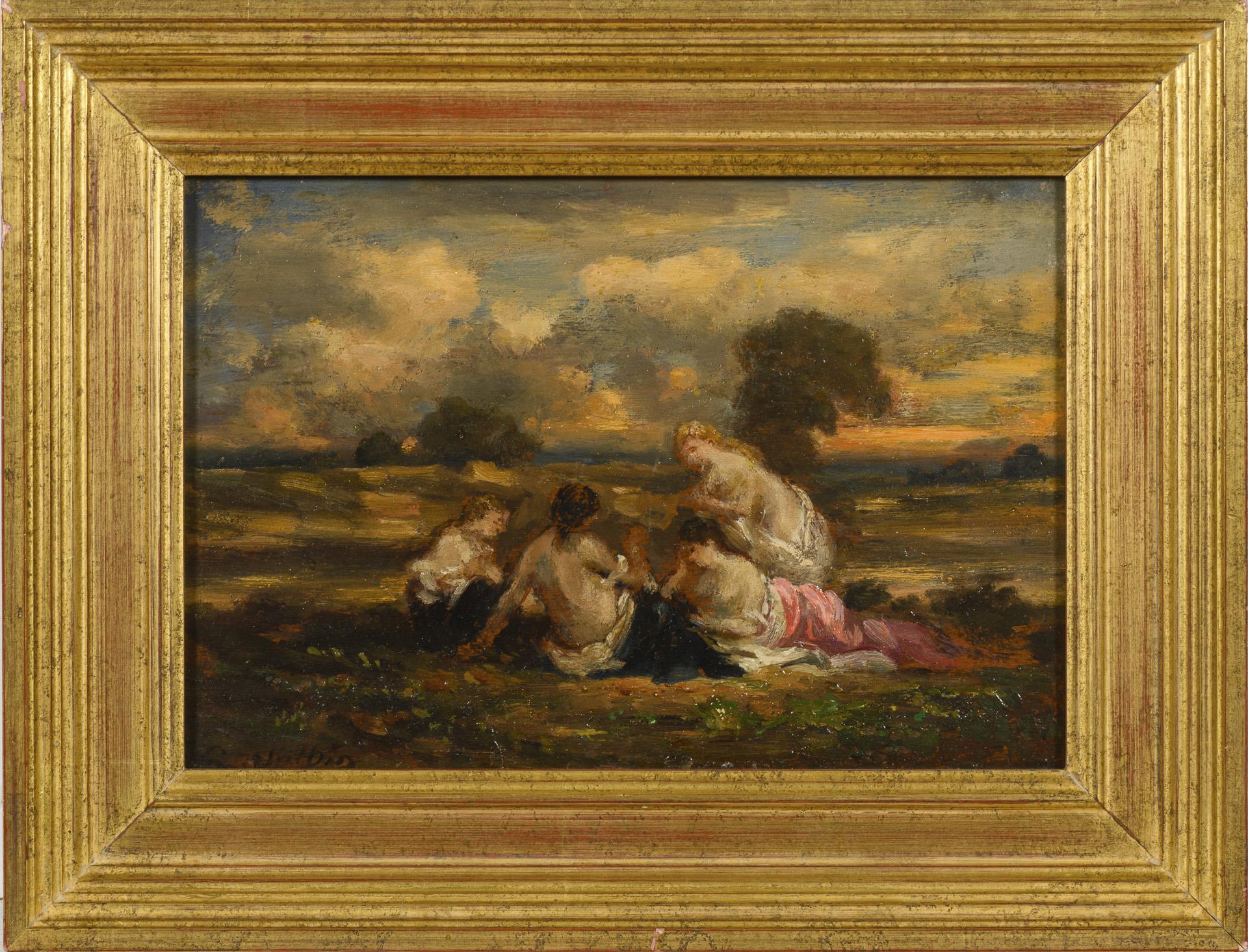Vier Frauen in antikisierender Kleidung in weiter, ebener Landschaft.