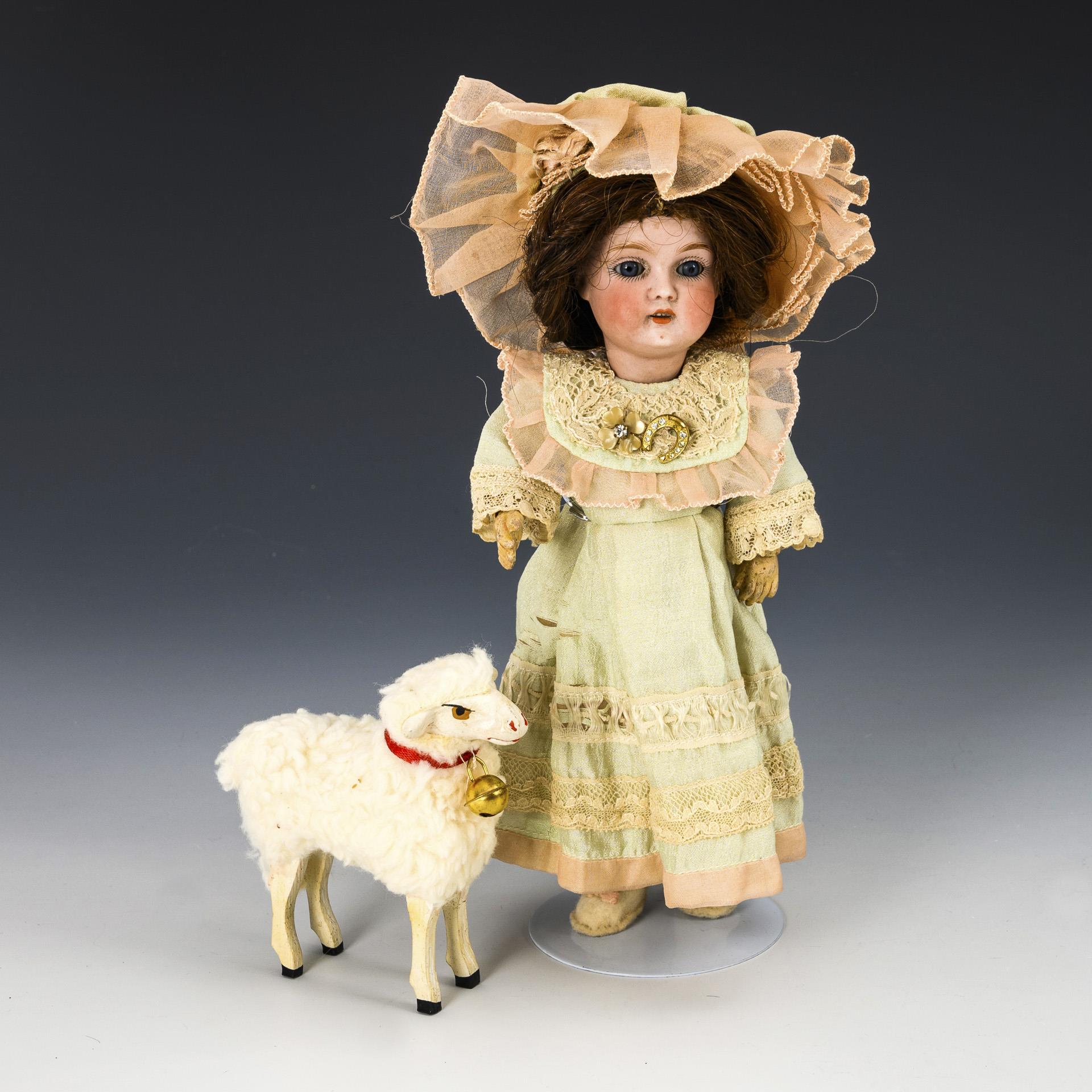 Kleines Püppchen mit Hut, dazu Wollschaf. J. D. Kestner.