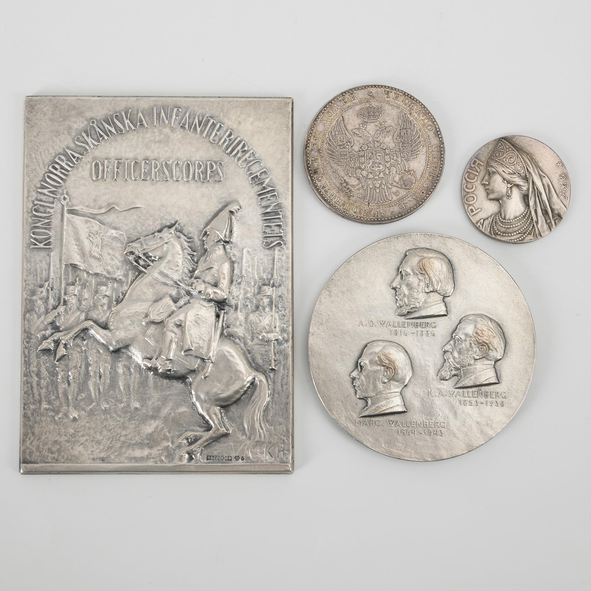 Große schwedische Plakette: Reitender Offizier vor stehnden Soldaten "Kong. Norr a Skanska Infanterieregementes Officerscorps"; mit Monogramm KH bezeichnet. Stockholm 1957, Meister S&Co gepunzt. / 3 Männerbildnisse aus der Familie Wallenberg. Rückseitig Palastansicht "Stockholms Enskilda Bank... 1956"; Ivar J-son bezeichnet. Schwedische Silberpunzen, Sporrong & Co. / Frauenbildnis kyrillisch Rossia betitelt, Ad. Rives bezeichnet. Rückseitig Engel und Zweig an der angebrachten Platte "Le Commerce et l'Industrie 1897", darüber Namensgravur. Argent gepunzt. / "1 1/2 Rubel 10 Zlot 1836". Rückseitig Doppeladler mit kyrillischer Umschrift. Kyrillische Buchstaben und Zahlen am Rand. Rubel starke Alters-/Gebrauchsspuren, sonst minimal.