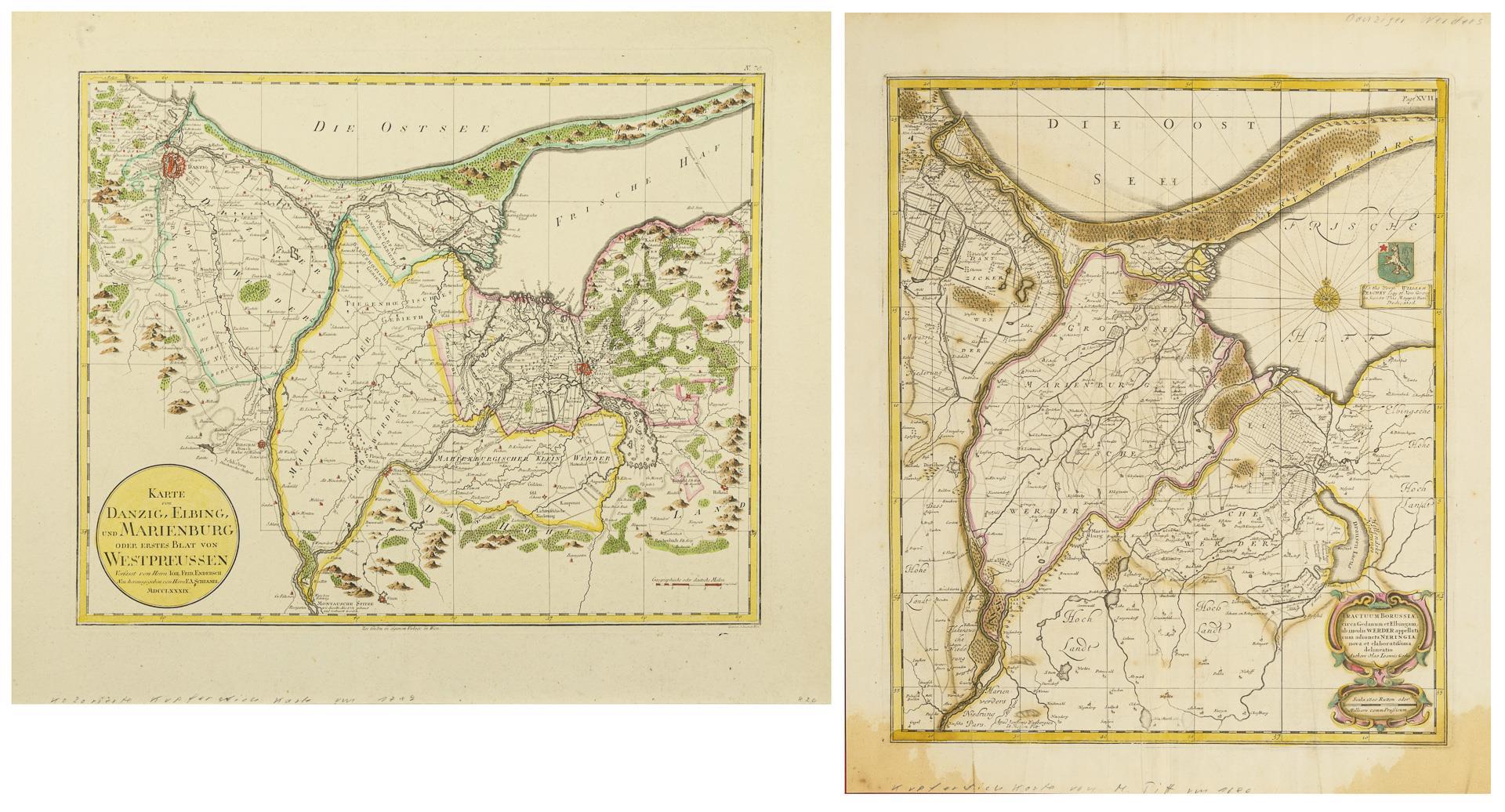 Endersch; Schraembl: ""Karte von Danzig, Elbing und Marienburg", Westpreussen, (Blatt 58,5 x 69 cm). / Gotho: "Tractuum Borussiae ...", Frisches Haff, (Blatt 57 x 47 cm). Alters- und Gebrauchsspuren.