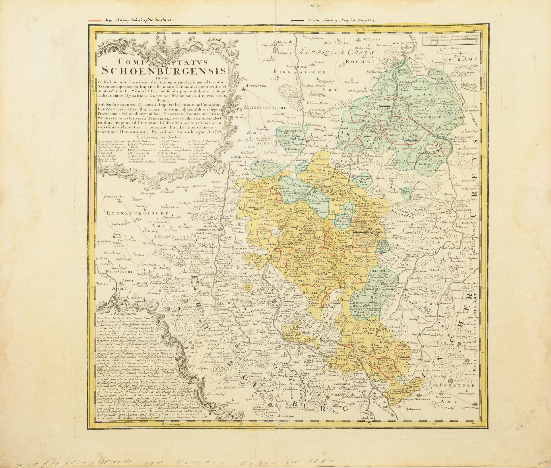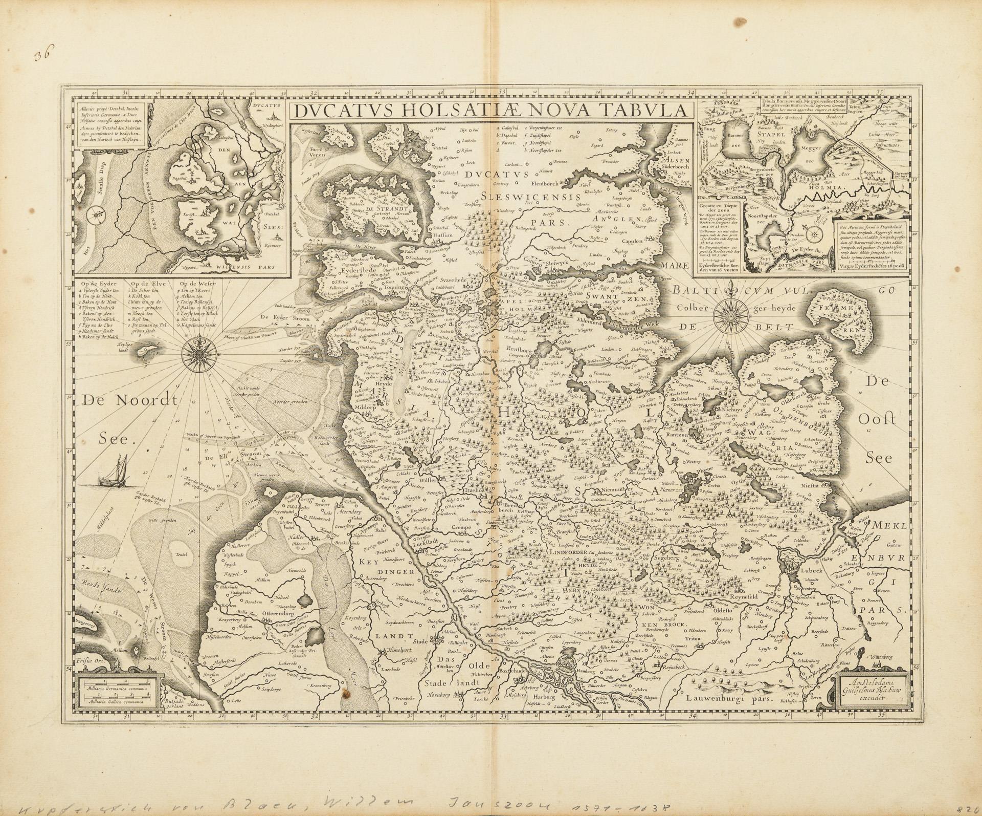 Hohmann: "Pars Vederovia ... Regionem Schwalbachensem", (47 x 55,5 cm; Ppt. 64 x 73 cm). / (Hohmann): Herzogthum Westphalen ( Blatt 53 x 62 cm) / "Bavariae", Niederbayern (Blatt 53 x 62 cm). / "Cursus Rhenia" (53,5 x 64 cm) / "Comitatus Schoenburgensis", (54,5 x 65 cm) / Seutter: "Comitatus Mansfeldensis" (Blatt 54,5 x 62,5 cm) / "Tabula Generalis Holsatiae" (Blatt 54 x 63 cm) / Visscher: Comitatus Hannoniae", rückseitig Typographie, ( Blatt 53 x 63 cm). / Tilemanno; Ortelius: "Mansfeldiae Comitatus", (Blatt 46 x 59,5 cm) / Blaeu: "Ducatus Holsatiae Nova Tabula", (Blatt 49 x 60,5 cm).