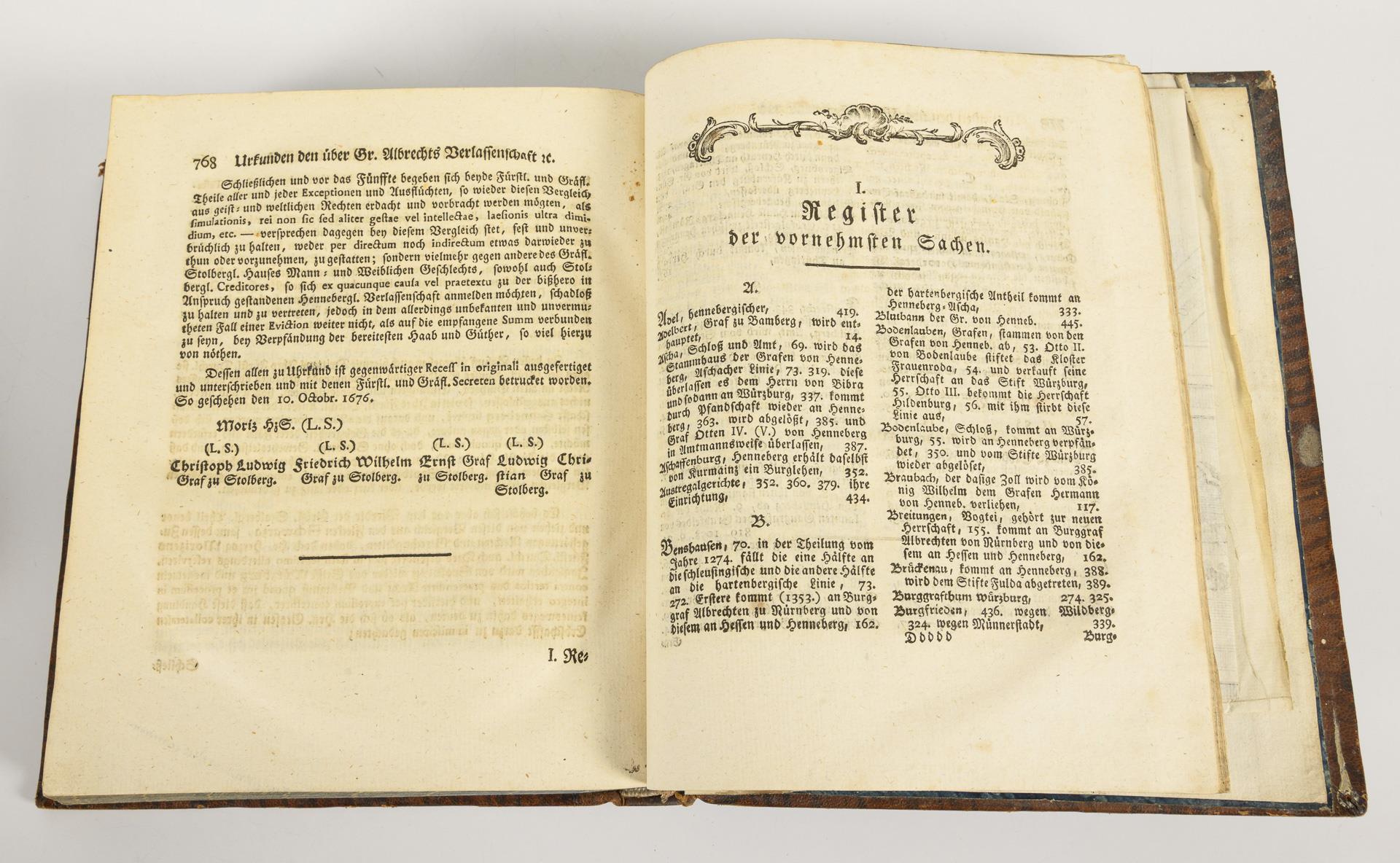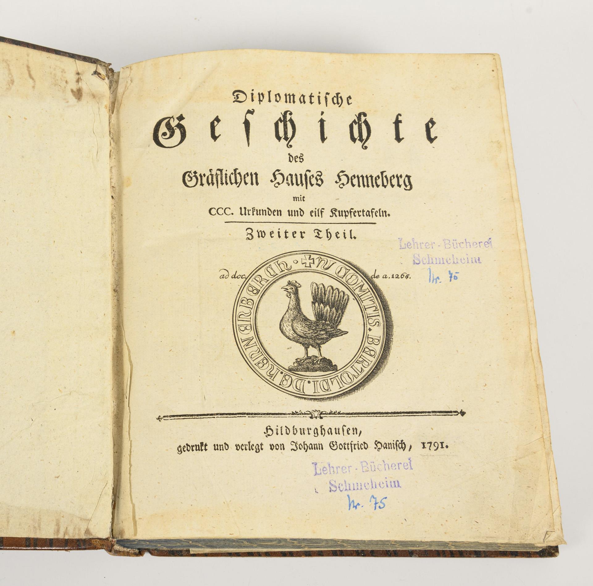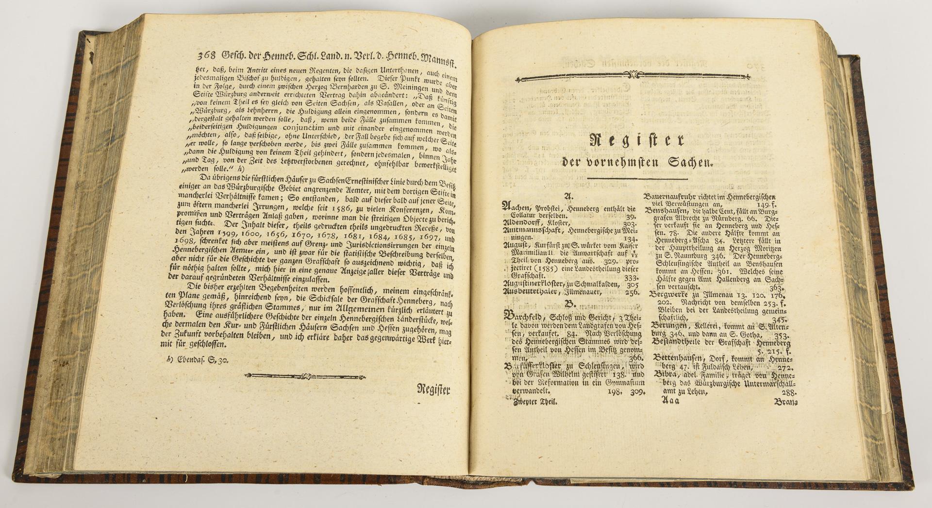 Mit Urkunden und Kupfertafeln, im originalen Ledereinband. Band I.: 38, (4), 794 Seiten mit 255 Urkunden und 9 Kupfertafeln; In Commißion bey Adam Friedrich Böhme, Leipzig 1788. / Band II.: (16), 543 Seiten mit 300 Urkunden und elf Kupfertafeln; Gedruckt und verlegt von Johann Gottfried Hanisch, Hildburghausen 1791. Nicht kollationiert.