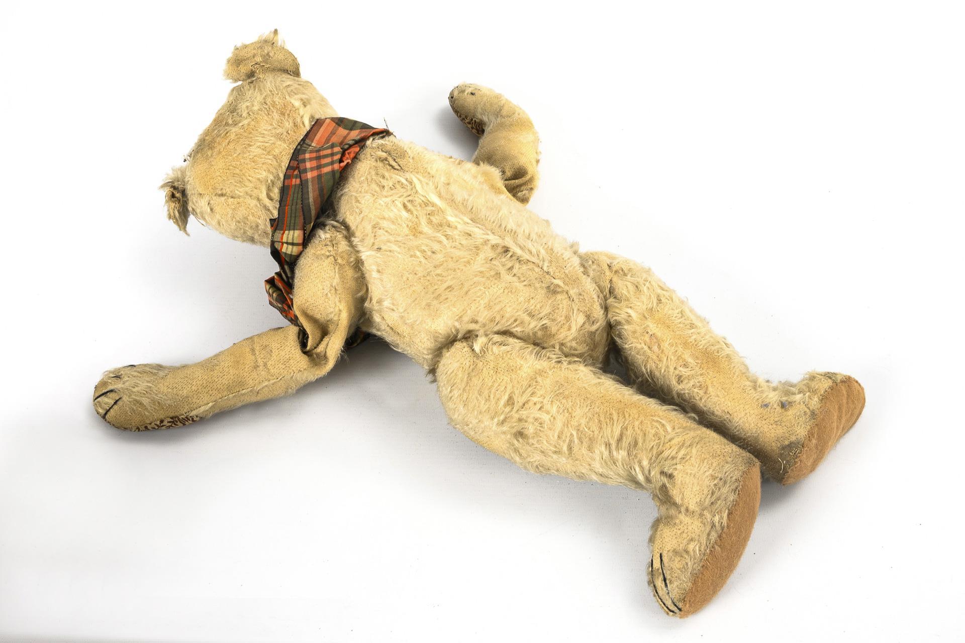 Weißer Steiff-Teddy (eventuell handelt es sich um einen Teddy Clown) mit dunkler Bestickung, Vorderpfoten mit Stoff übernäht, Stopfung locker, karierte Stoffschleife, Knopf mit langem "F", L 45 cm. / Hochwertiger Thüringer? Teddy mit sehr spitzer Schnauze, blond, Glasaugen, schwarze Bestickung, eine der Filzpfoten übernäht, L 49 cm. / Räderhund mit hochwertigem Gestell, Schuhknopfaugen, roten Filz-Innenohren, Nasengarnierung und 3 Krallen, verkahlte Fellflecken, 34 x 40 cm. Als Zugabe alte Kinder-Ziehharmonika, auf altem Etikett bezeichnet "Victorian Squeeze Box". Alle Tiere mit starken Altersspuren und Reparaturstellen, verkahlt.