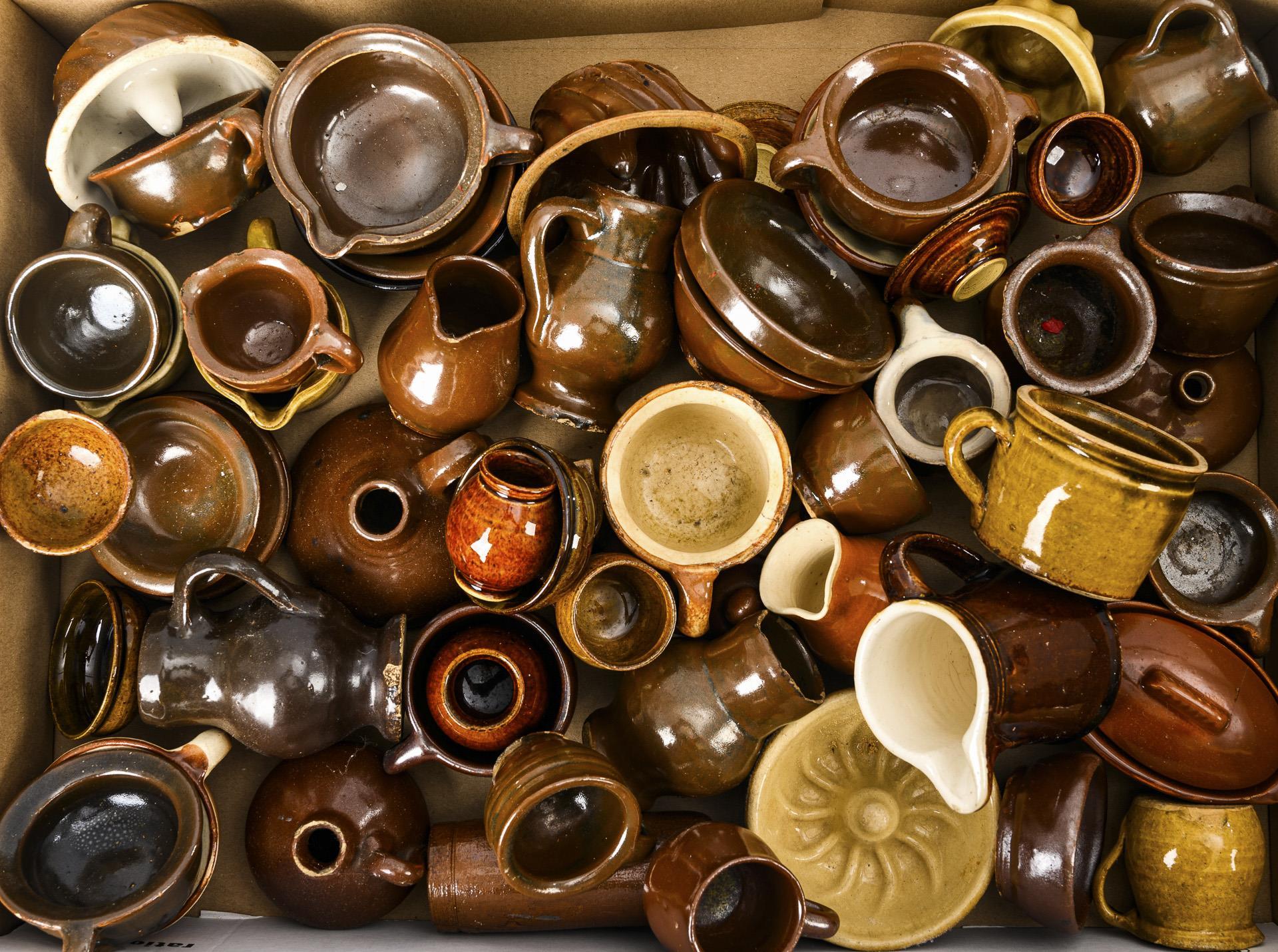 Über 50 verschiedene Teile Keramikgeschirr, vorwiegend mit Lehmglasur.