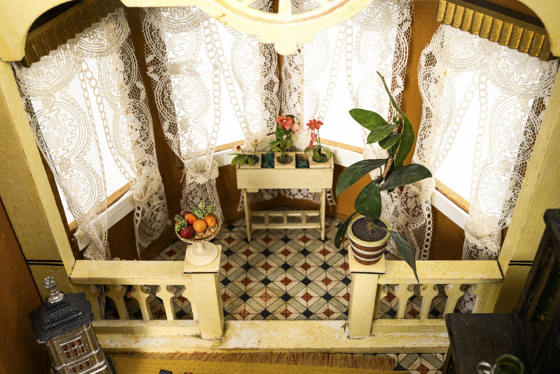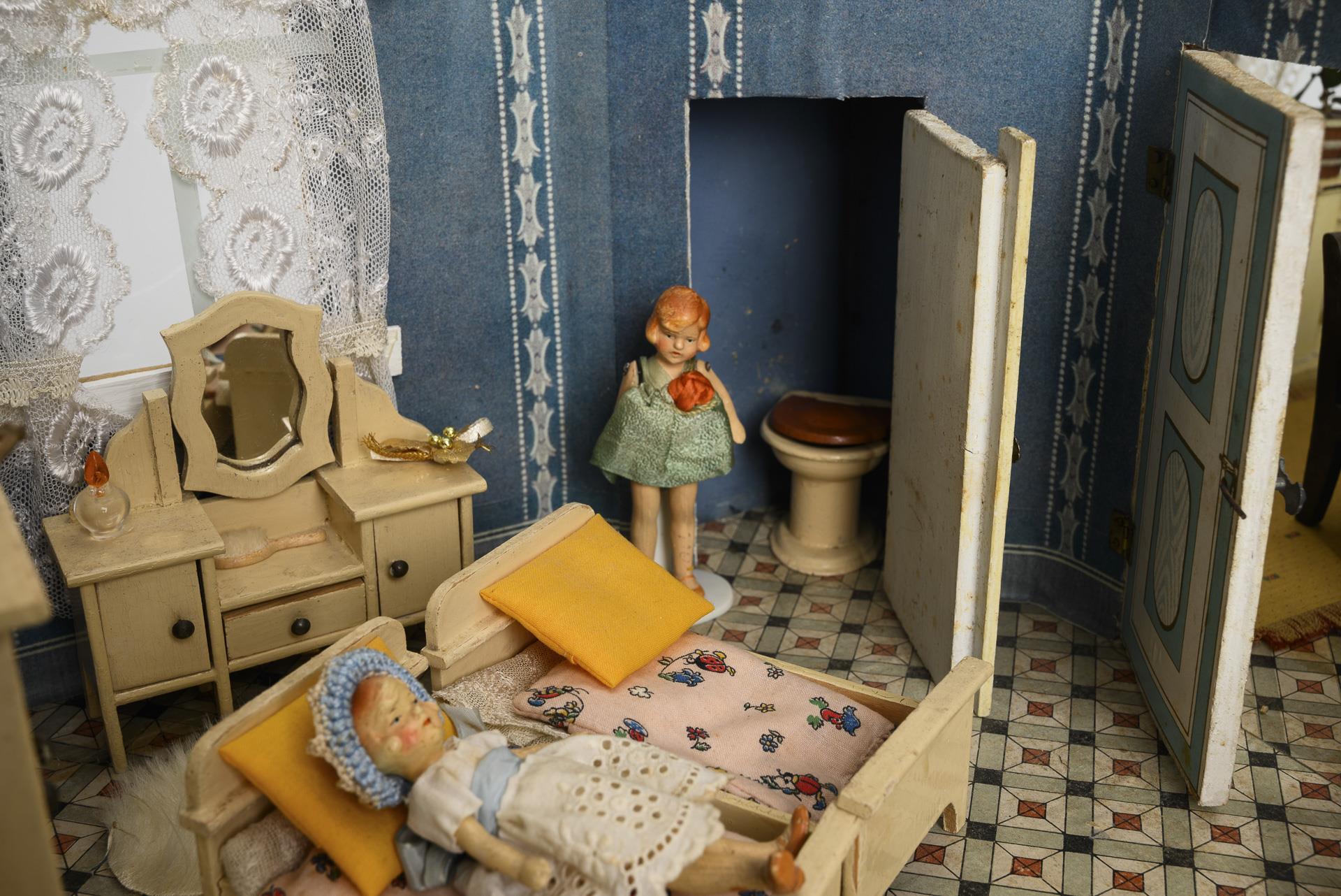 2-Raum-Gehäuse mit verglasten Fenstern und 2 beweglichen Türen. Als Schlafzimmer mit weiß gestrichenen Möbeln und als Esszimmer mit dunkelbraunen Möbeln und Zinnofen eingerichtet. Dazu 3 Püppchen mit Defekten. Bespielt, überarbeitet und nachtapeziert.