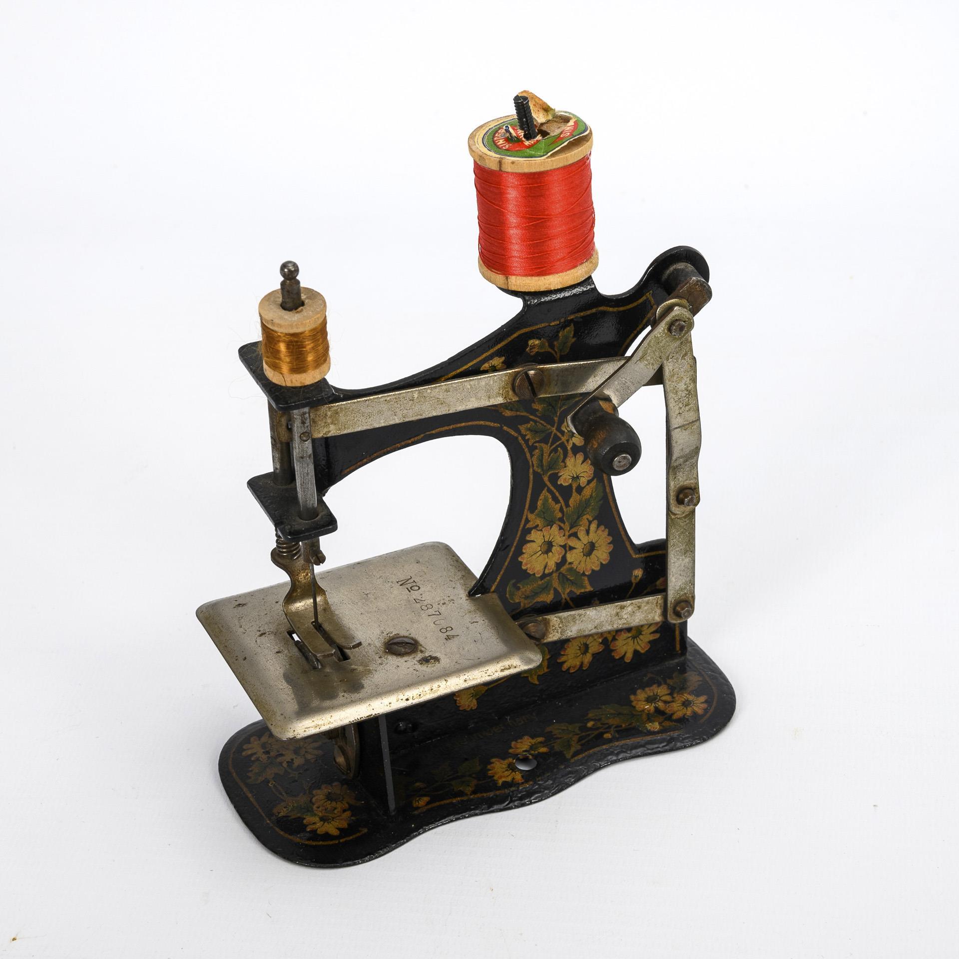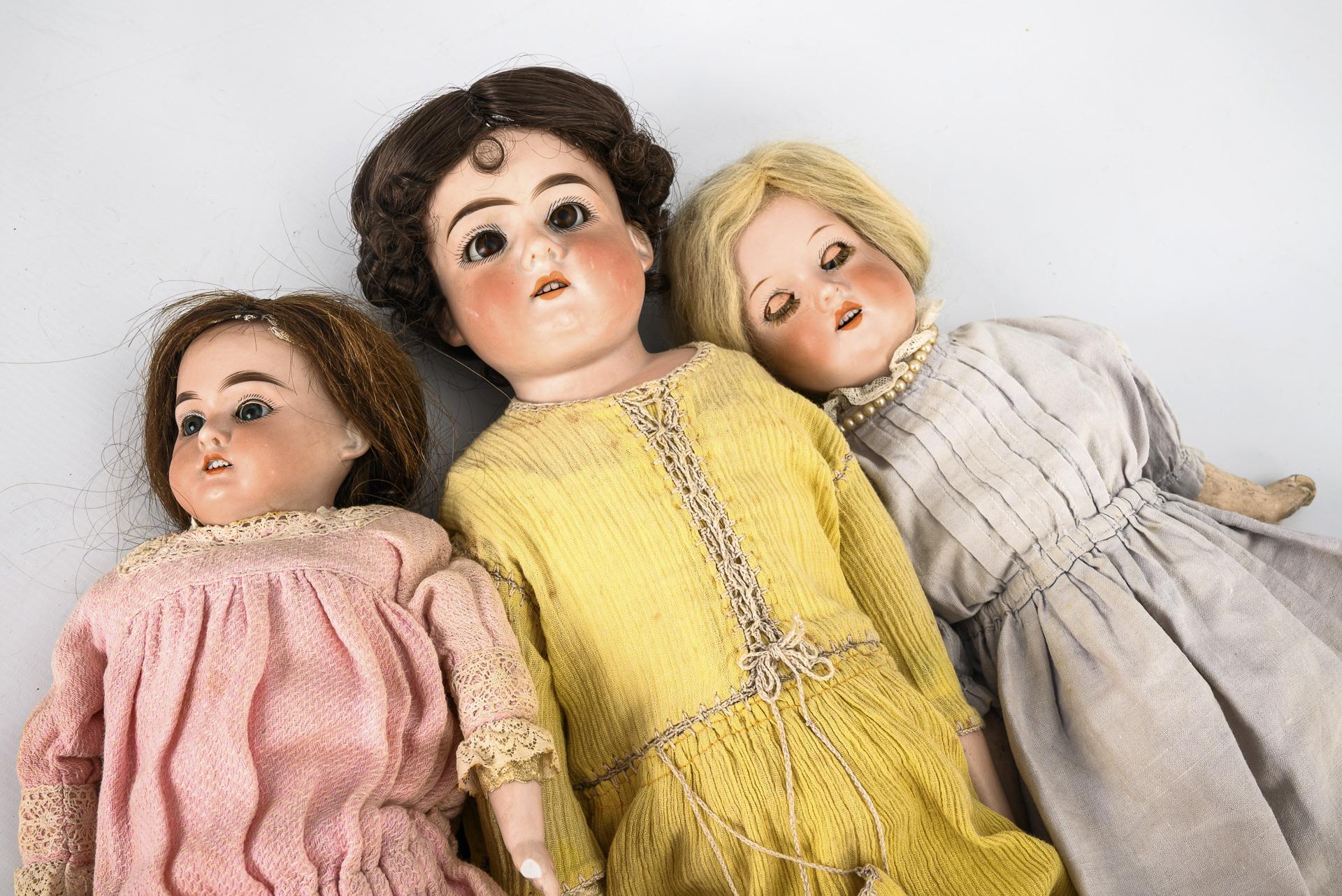 AM 3200 in rosa Kleid, mit brauner Echthaarperücke, Lederkörper, defekten Biskuitarmen (L 44 cm). / AM 370 in hellem Kleid, mit blonder Mohairperücke, verschmutztem Stoffkörper, bestoßenen Massegliedern (L 47 cm). / AM 370 in gelbem Kleid, mit brauner Kunsthaarperücke, defekten Biskuitarmen, Lederkörper (L 58 cm). Dazu einfache Nähmaschine aus schwarz lackiertem Metall mit floralem Golddekor (No. 287084), 15 x 12 x 6 cm. Köpfe nicht durchleuchtet.