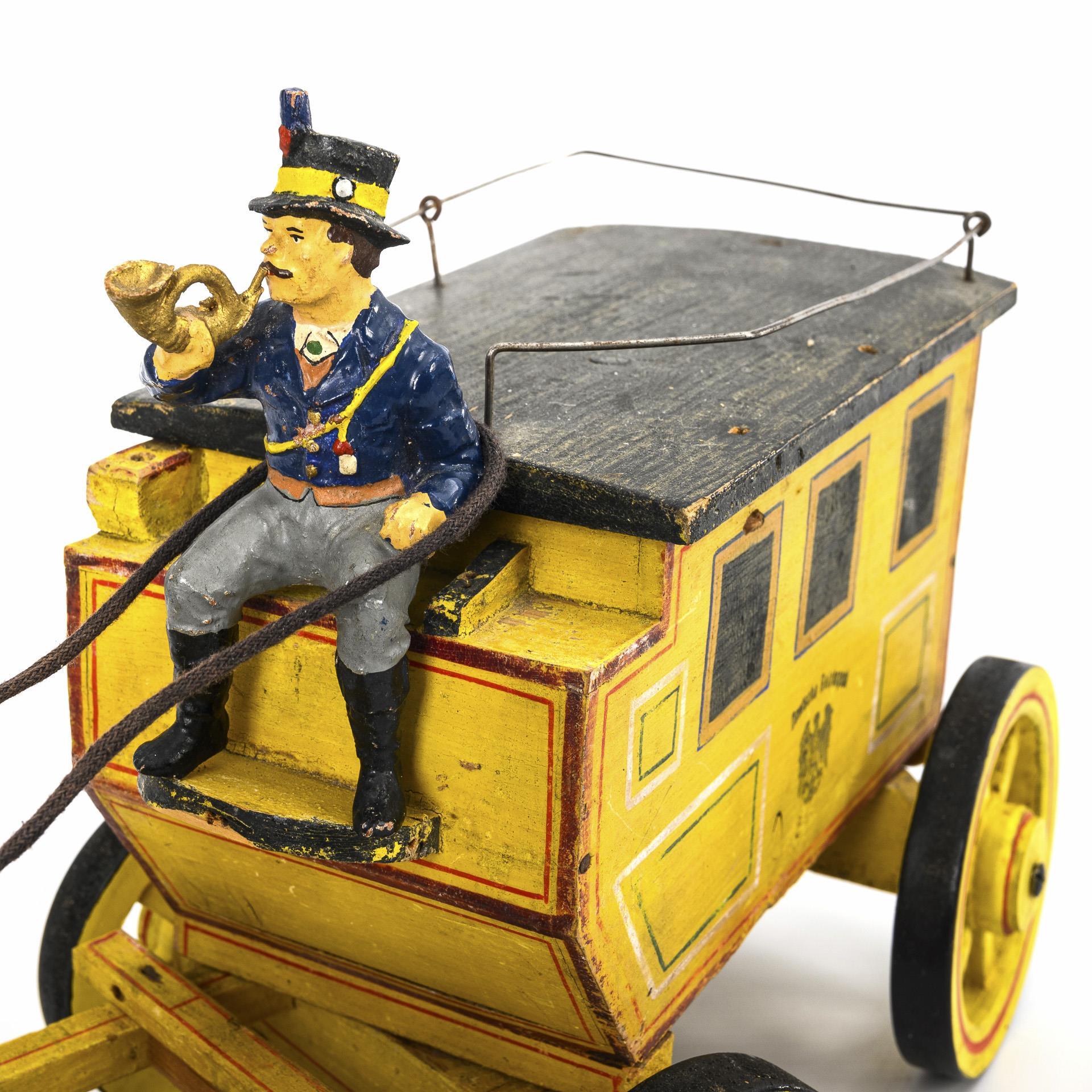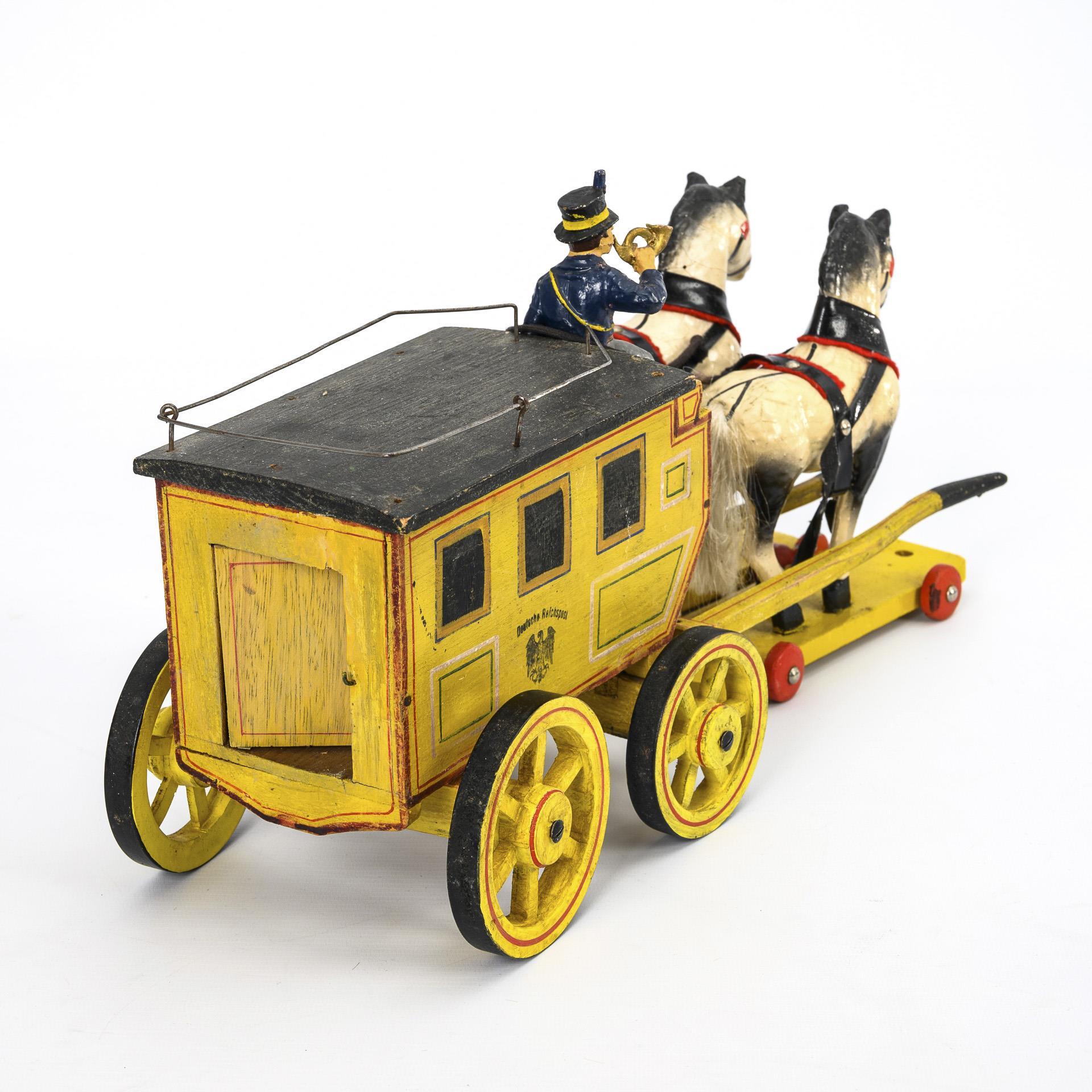 Gelb gestrichene Kutsche "Deutsche Reichspost" mit Kutscher und 2 Pferden auf Räderplatte. Bespielt, kleine Defekte, Kutscher mit minimalen Retuschen.