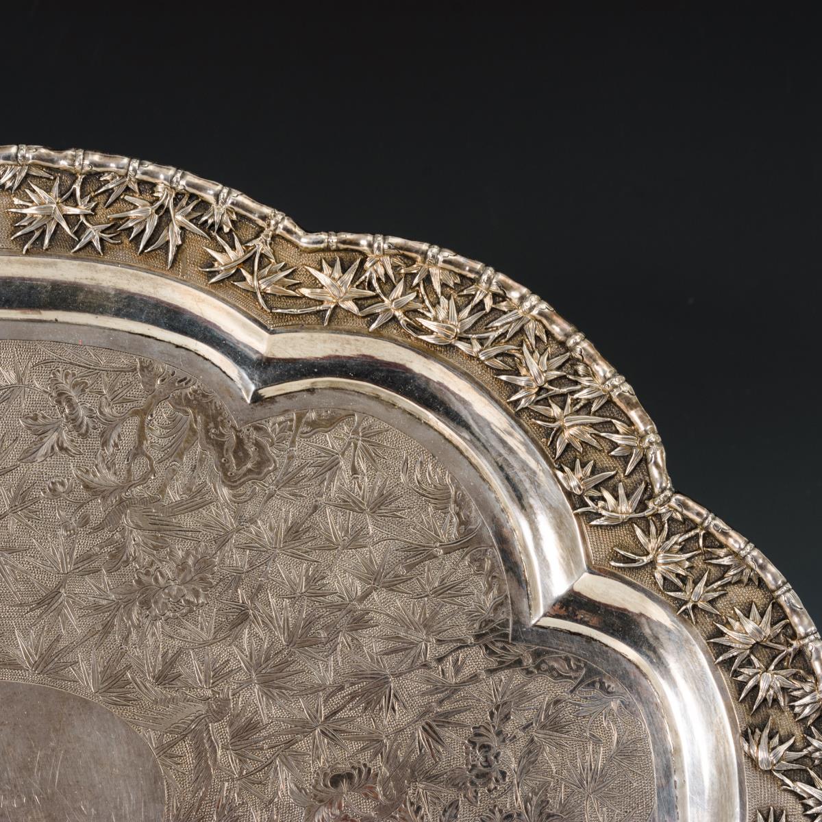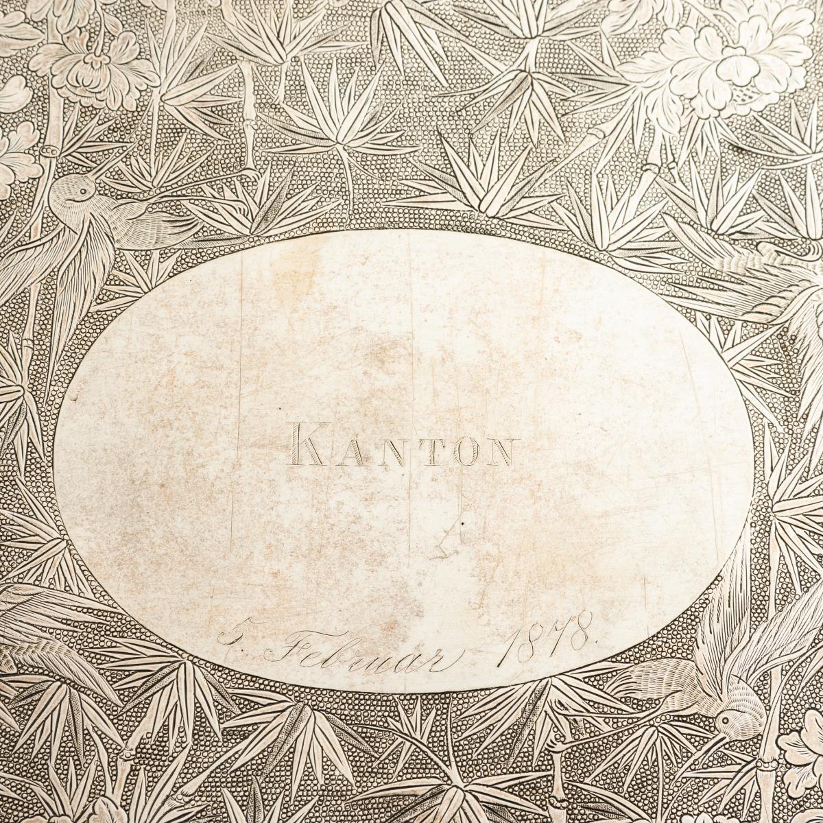 Passig-ovale Form mit Bambusmotiven und Gravur "Kanton 5. Februar 1878". Lötstellen an den Füßen.