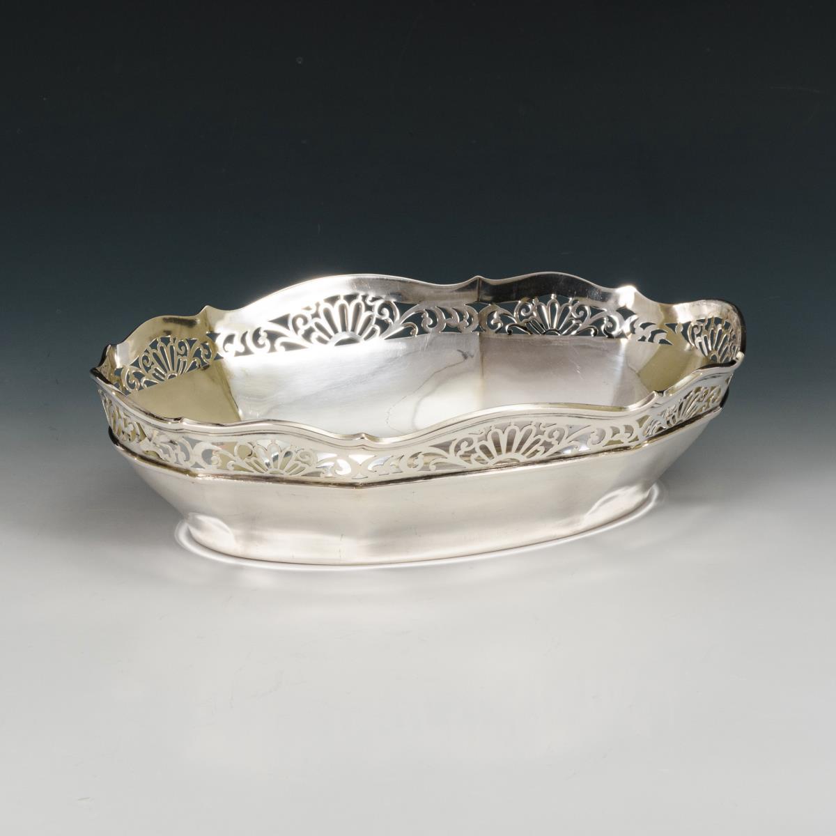 Ovale Schale mit facettierter Wandung und floralem Durchbruchband. Wenige, winzige Dellen.