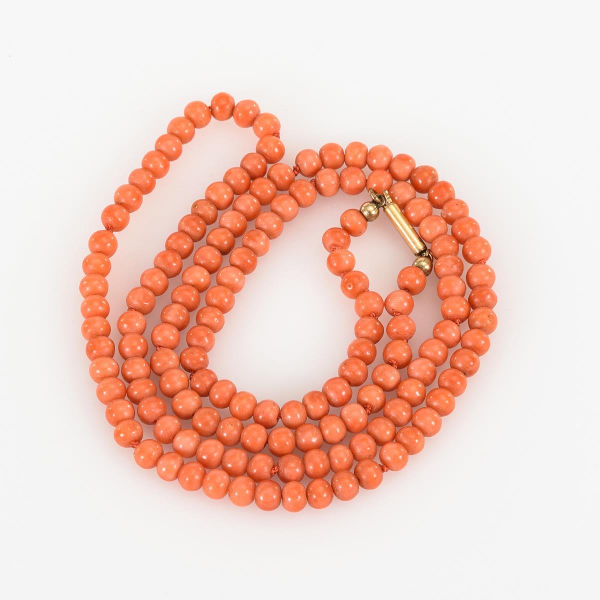 Schnürkette mit Korallenkugeln, partiell verknotet an Hülsenschloss.