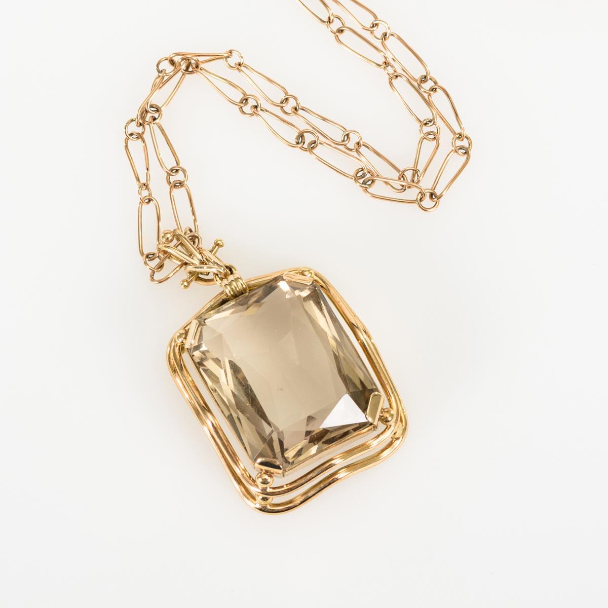Hellgoldener, krappengefasster Stein in steg- und granalienverziertem Rahmen. Grobe Ankerketten mit Karabinerverschluss.
