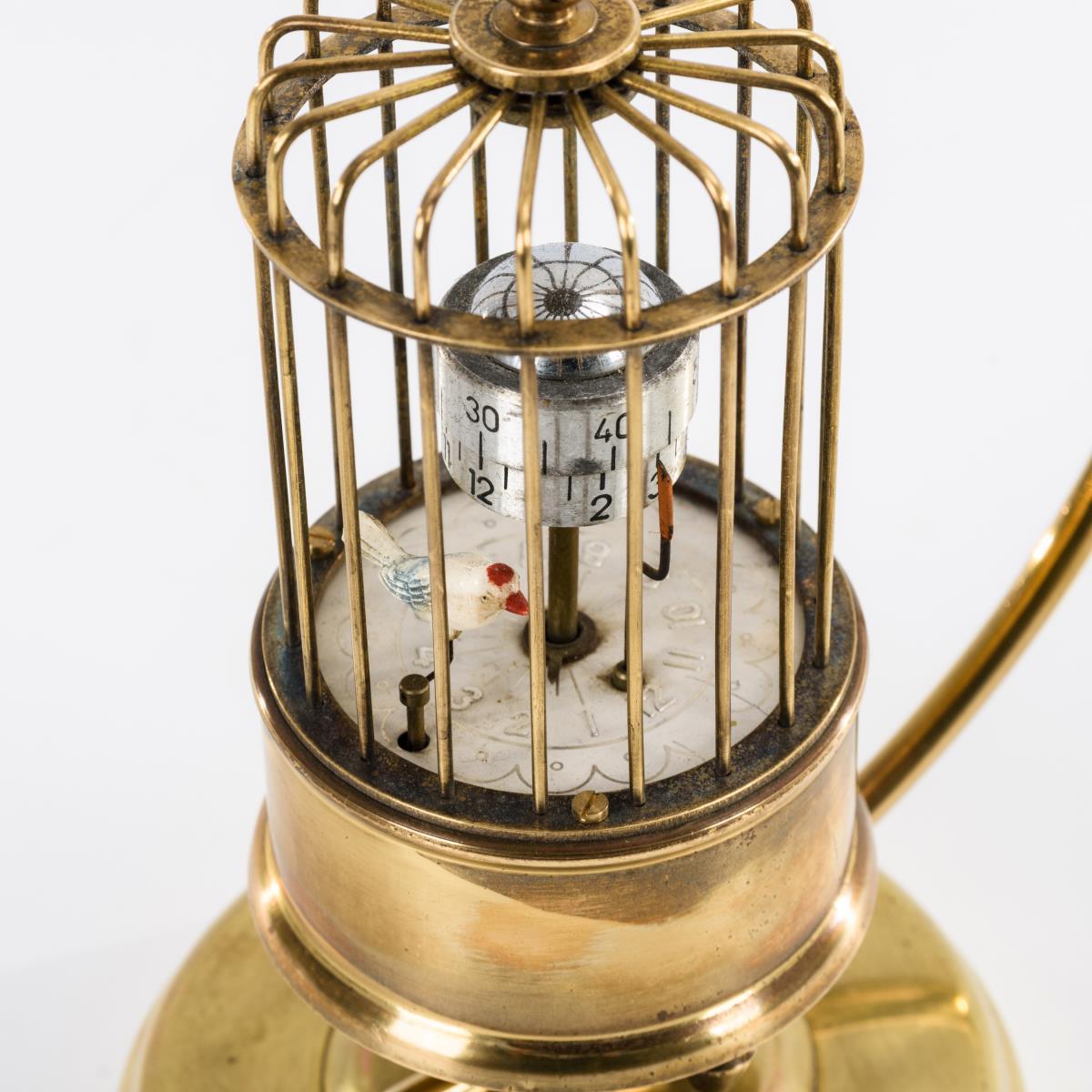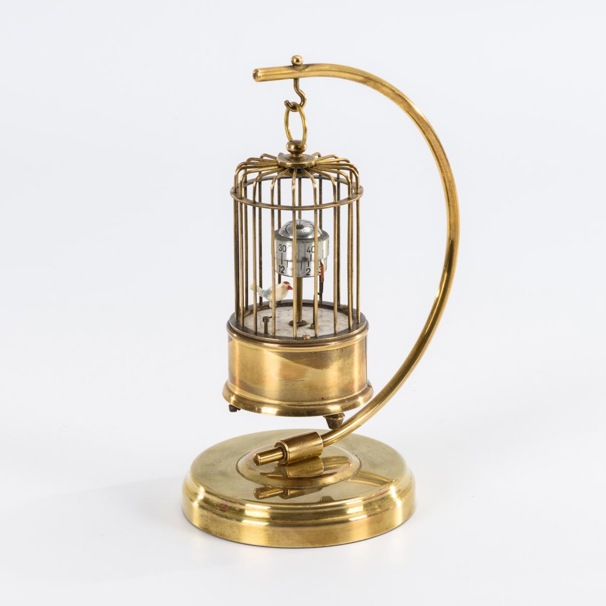 Vermessingtes Metallgestell und aufhängbarer Vogelkäfig mit drehbarer Uhr und einem mit dem Unruh-Schwingsystem verbundenen kleinen Vogel. Läuft. Leicht berieben.