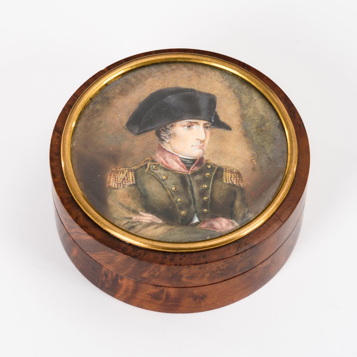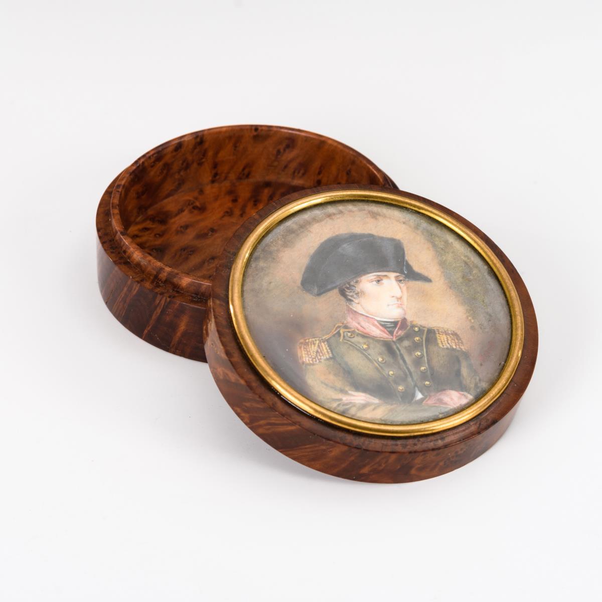 Runde Drechseldose, auf dem Deckel verglaste Miniatur mit dem Brustbildnis des Kaisers. Wasserschäden am Rand der Miniatur.
