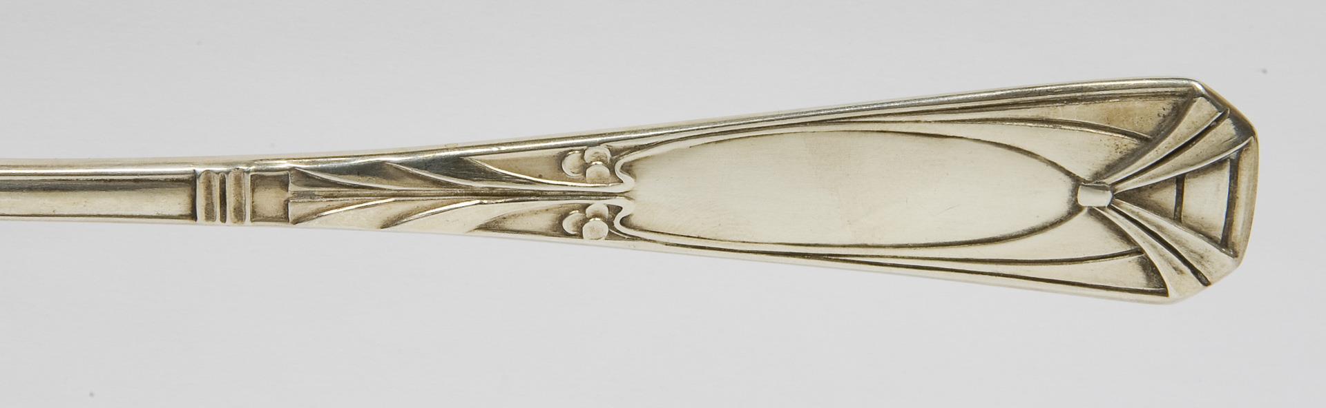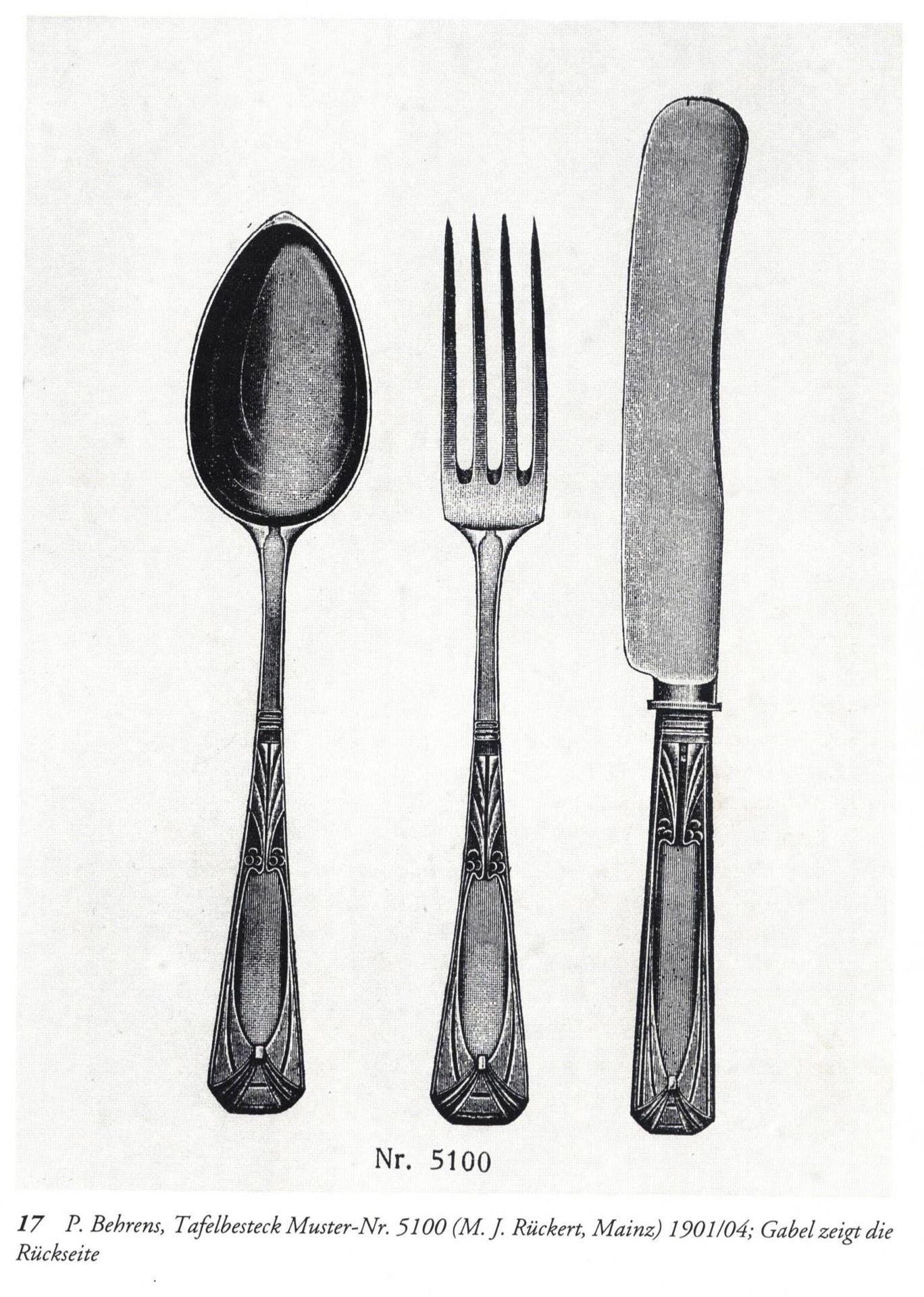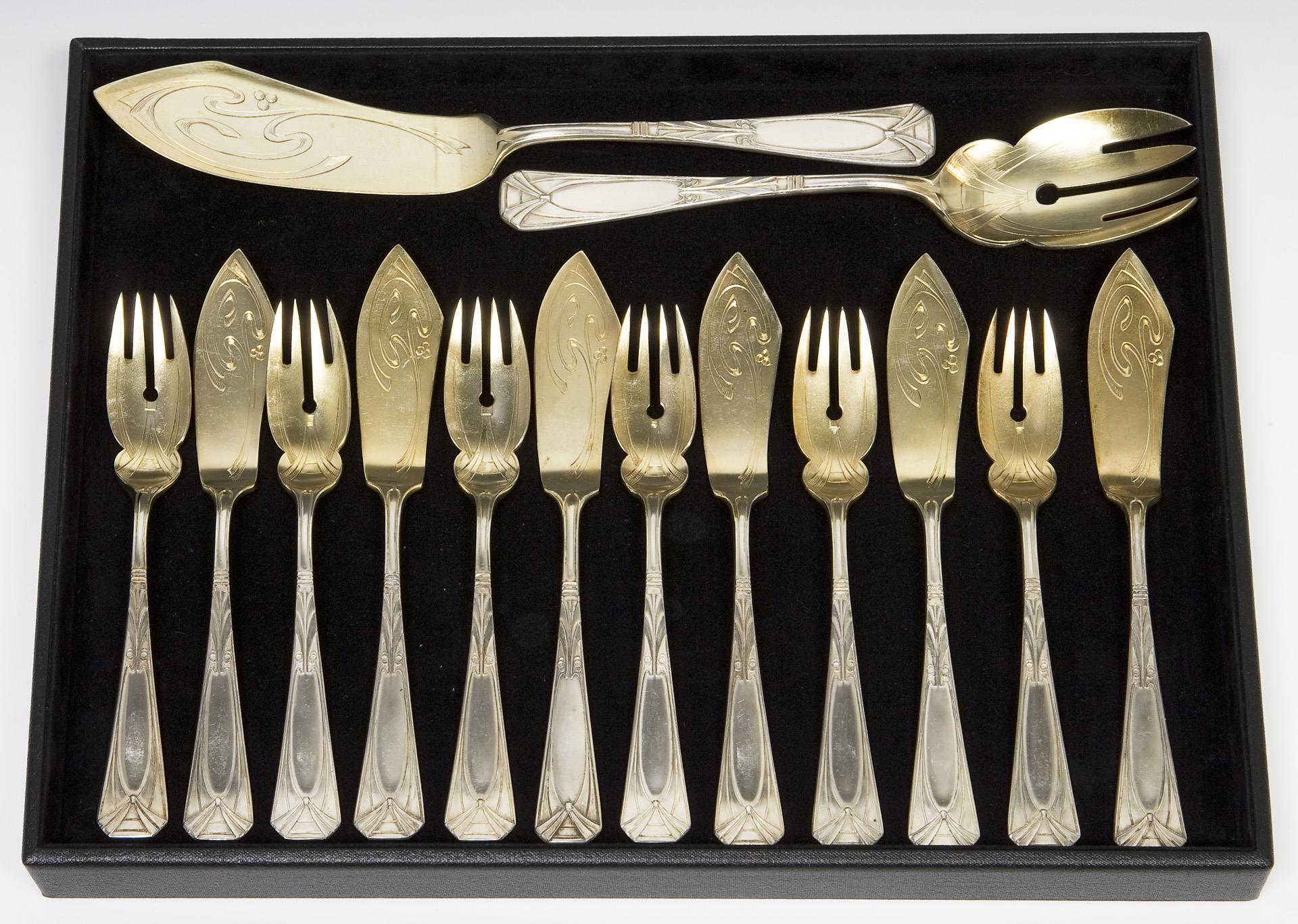 Von Peter Behrens überarbeiteter Werksentwurf 1901-1904. Besteck-Muster Nr. 5100. 14 Teile: 6 Fischmesser, 6 Fischgabeln, 1 Servier-Fischmesser, 1 Servier-Fischgabel. Beidseits ornamental reliefiert. Punzen: Halbmond und Krone, Feingehalt, Fabrikmarke.