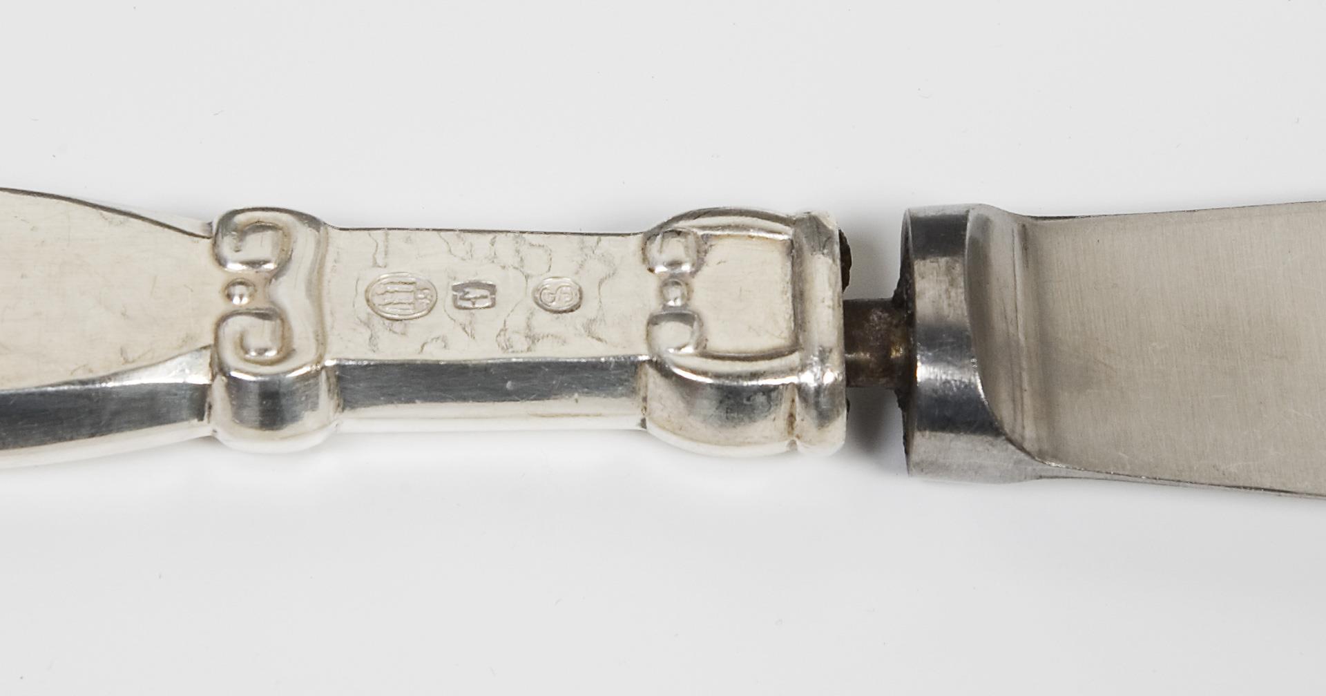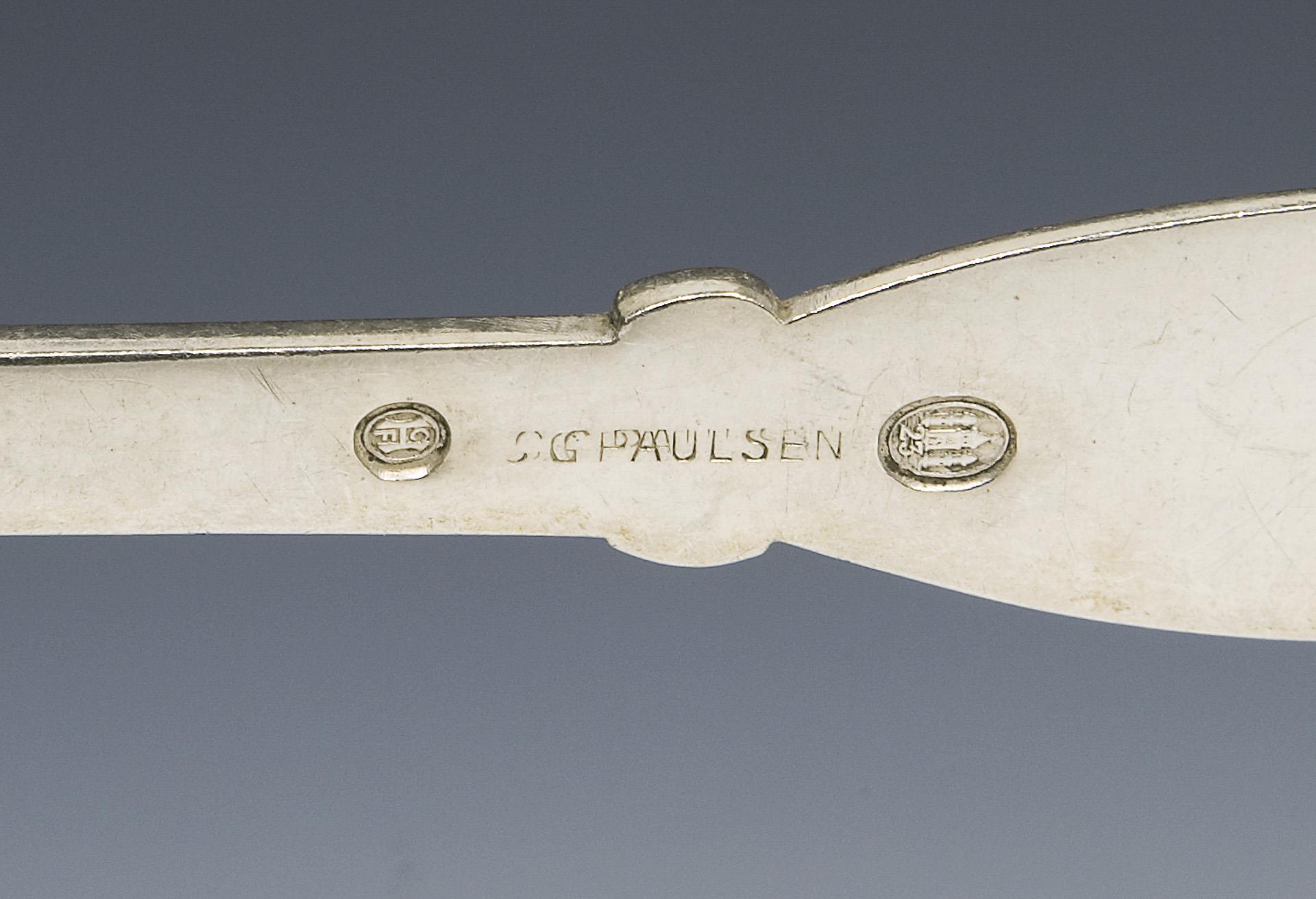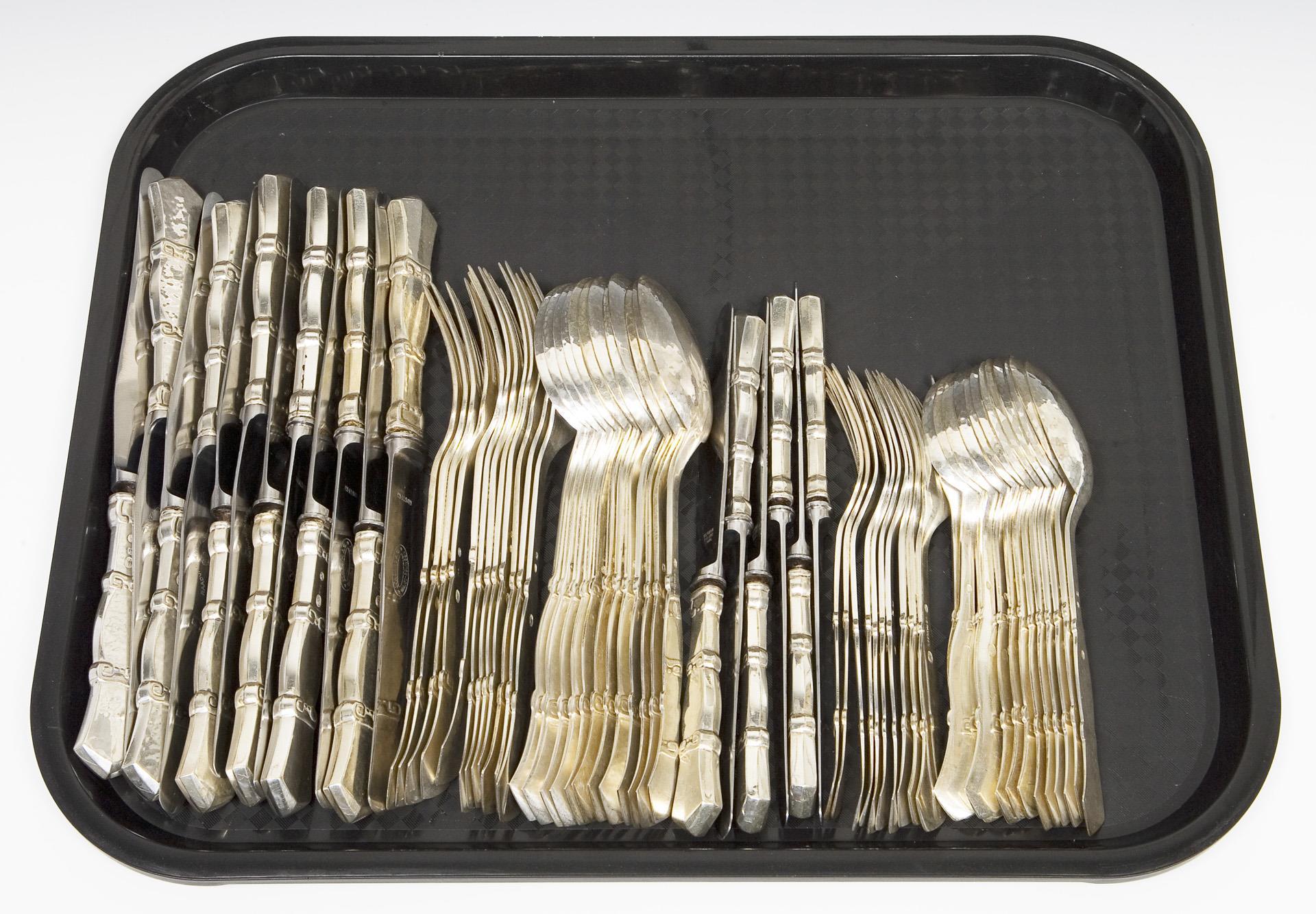 65 Teile: 12 Messer, 12 Gabeln, 12 Esslöffel, 6 Menü-Messer, 11 Menü-Gabeln, 12 Menü-Esslöffel. Messer mit rostfreien Stahlklingen von Macero-Solingen und von Raadvard. Punzen: Stadtmarke mit Jahreszahl, Wardein von C. F. Heise und Johannes Siggard, teils Marken von Eiler & Marloe oder Schriftzug C. G. Paulsen oder Monogramme CGP, ein Teil von 1937. Klingen müssen neu montiert werden.